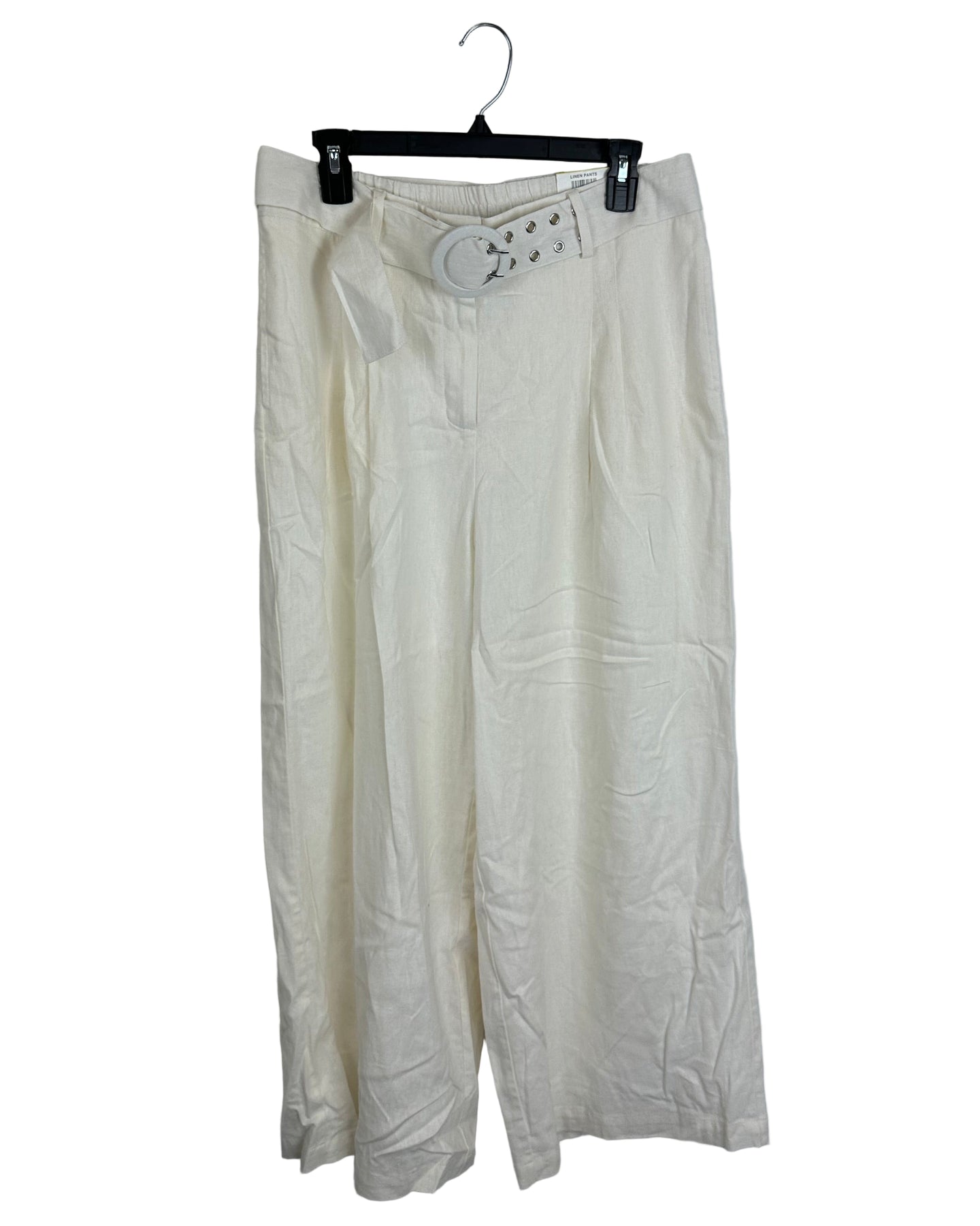 Unknown ivory pants with double pleats on the front, wide leg, belt loops with removable matching belt with silver hardware in a soft, linen fabric.