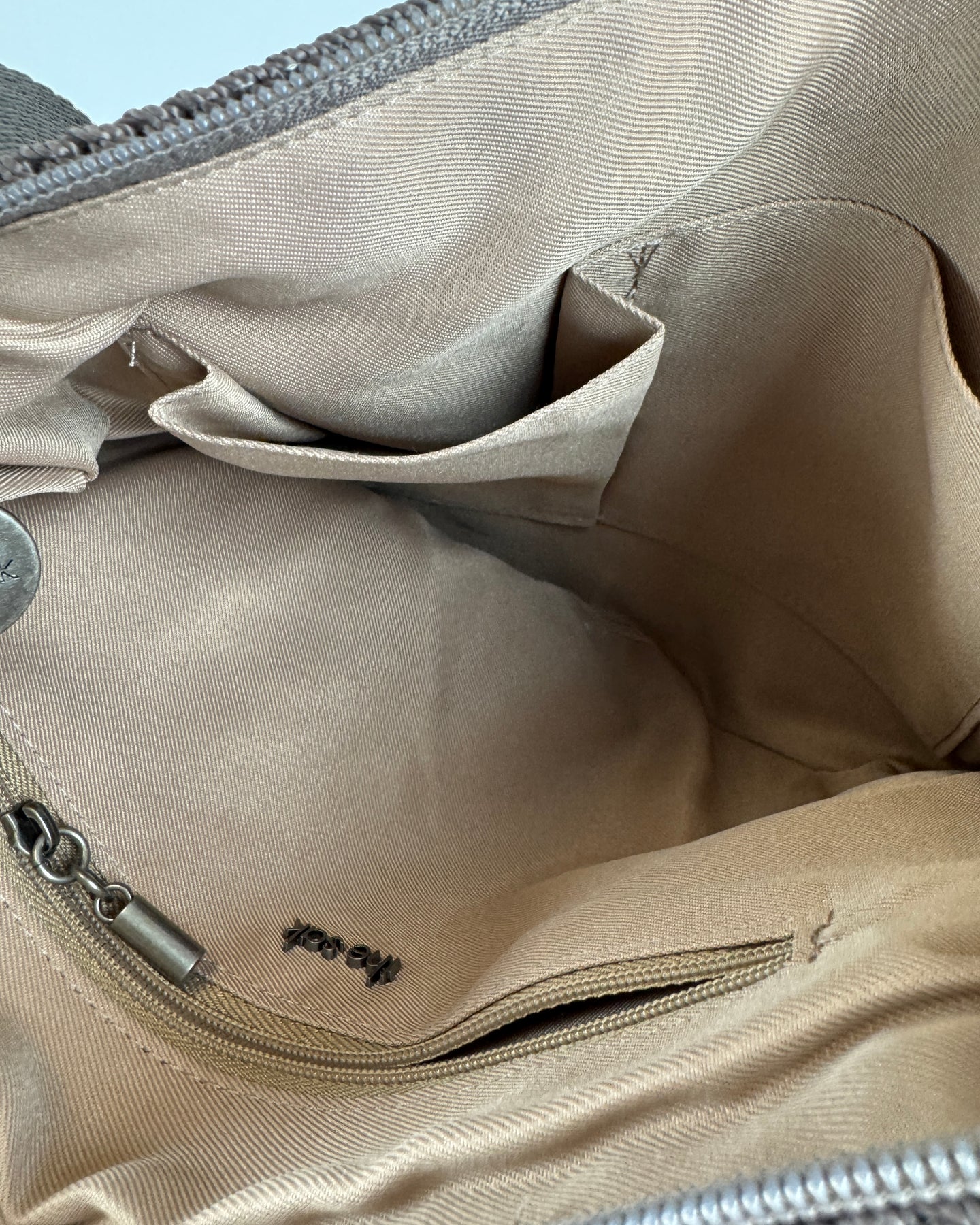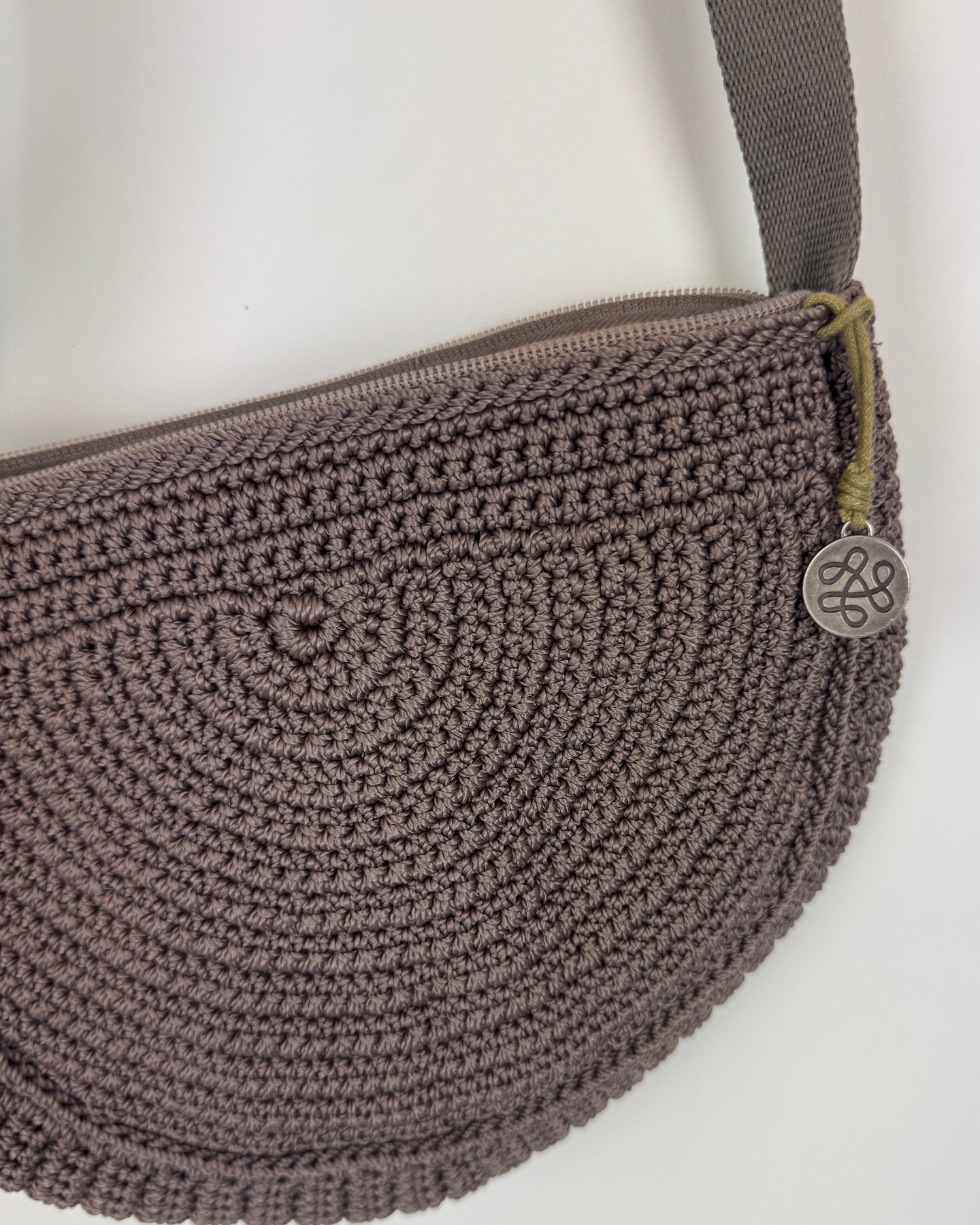 The Sak rounded crossbody bag, light brown crochet exterior, fabric adjustable strap, silver hardware, silver the sak logo tag, tan interior with two slit pockets, and a zippered pocket