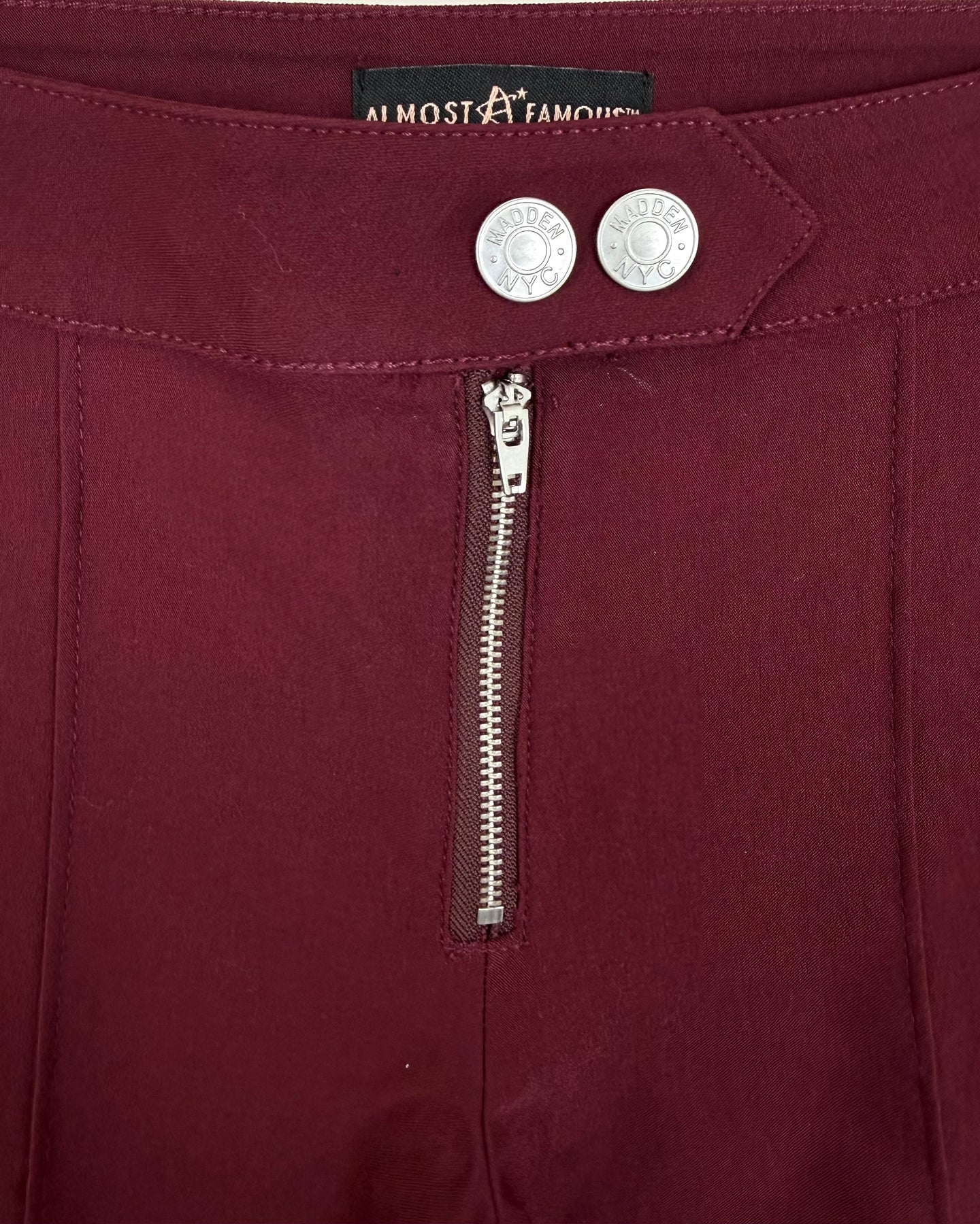 Almost famous mid-rise wine flare pants with front zipper, and two front buttons.