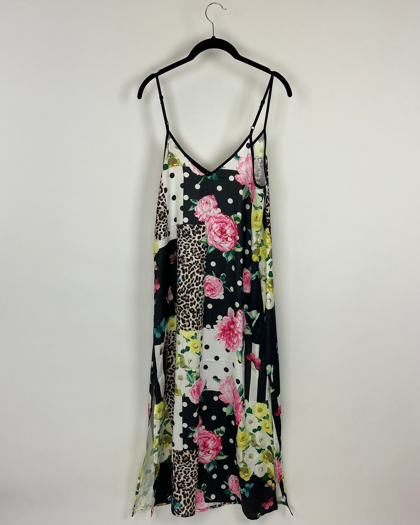 Multi pattern long and lightweight dress with a side slit, v-neckline, adjustable straps and cheetah print, polka dots, and floral detail