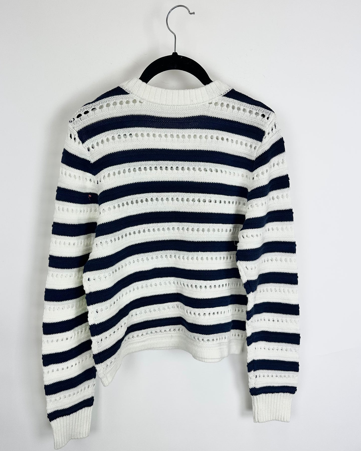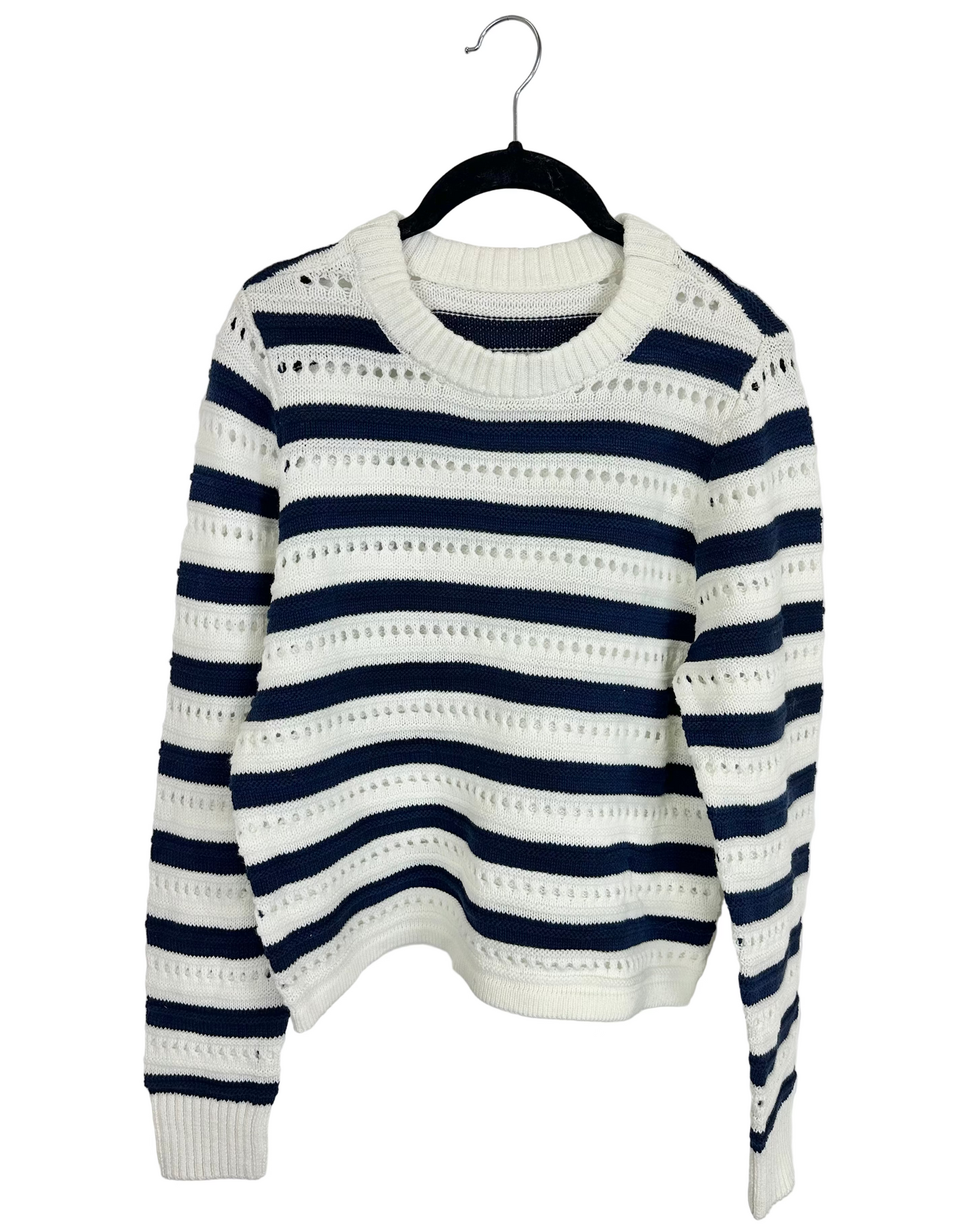 Reunited navy blue and white striped crochet, open knit sweater with a crew neckline and long sleeves