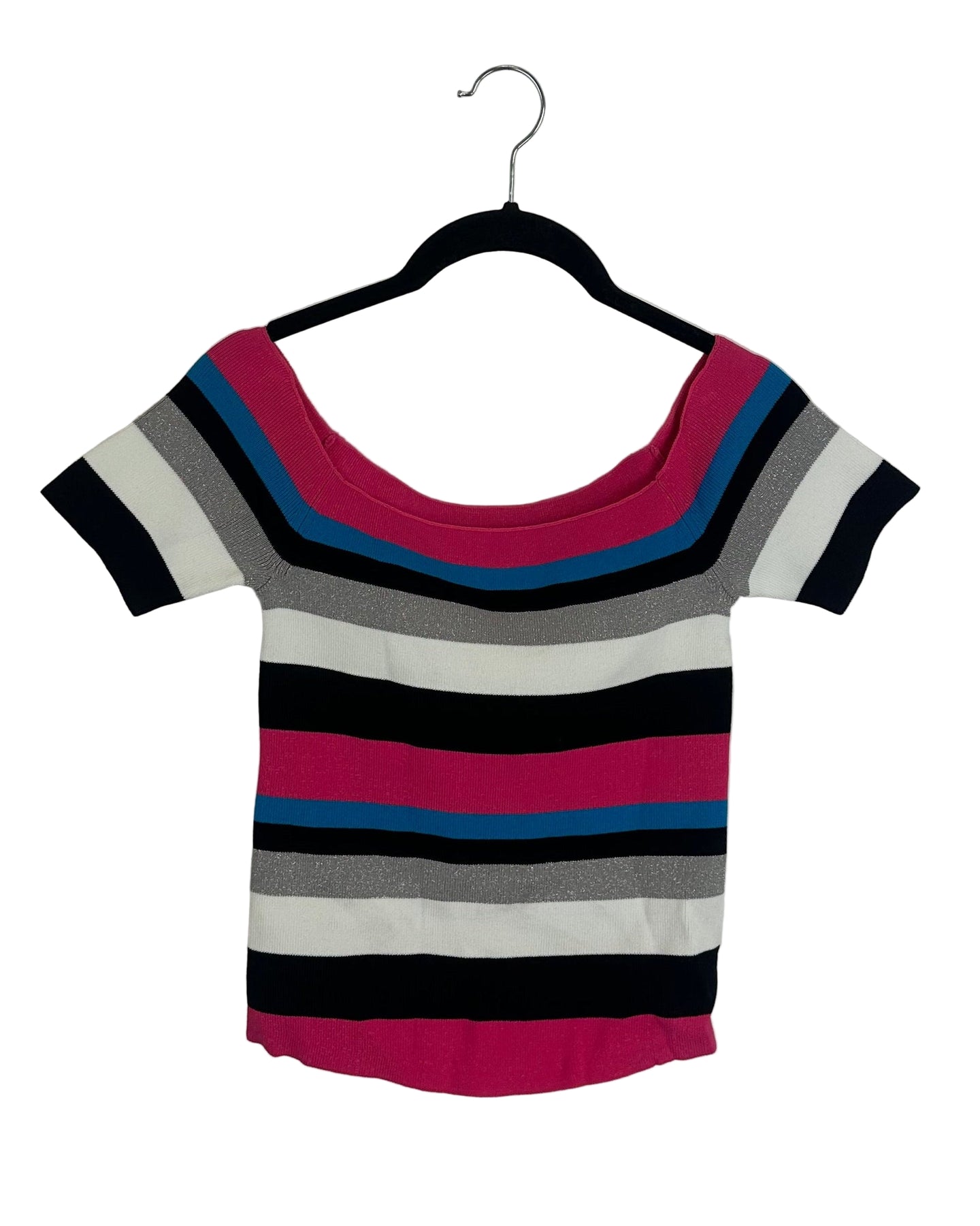 Off-the-shoulder knit shirt, multicolored stripe design, stretchy, fitted, and lightweight
