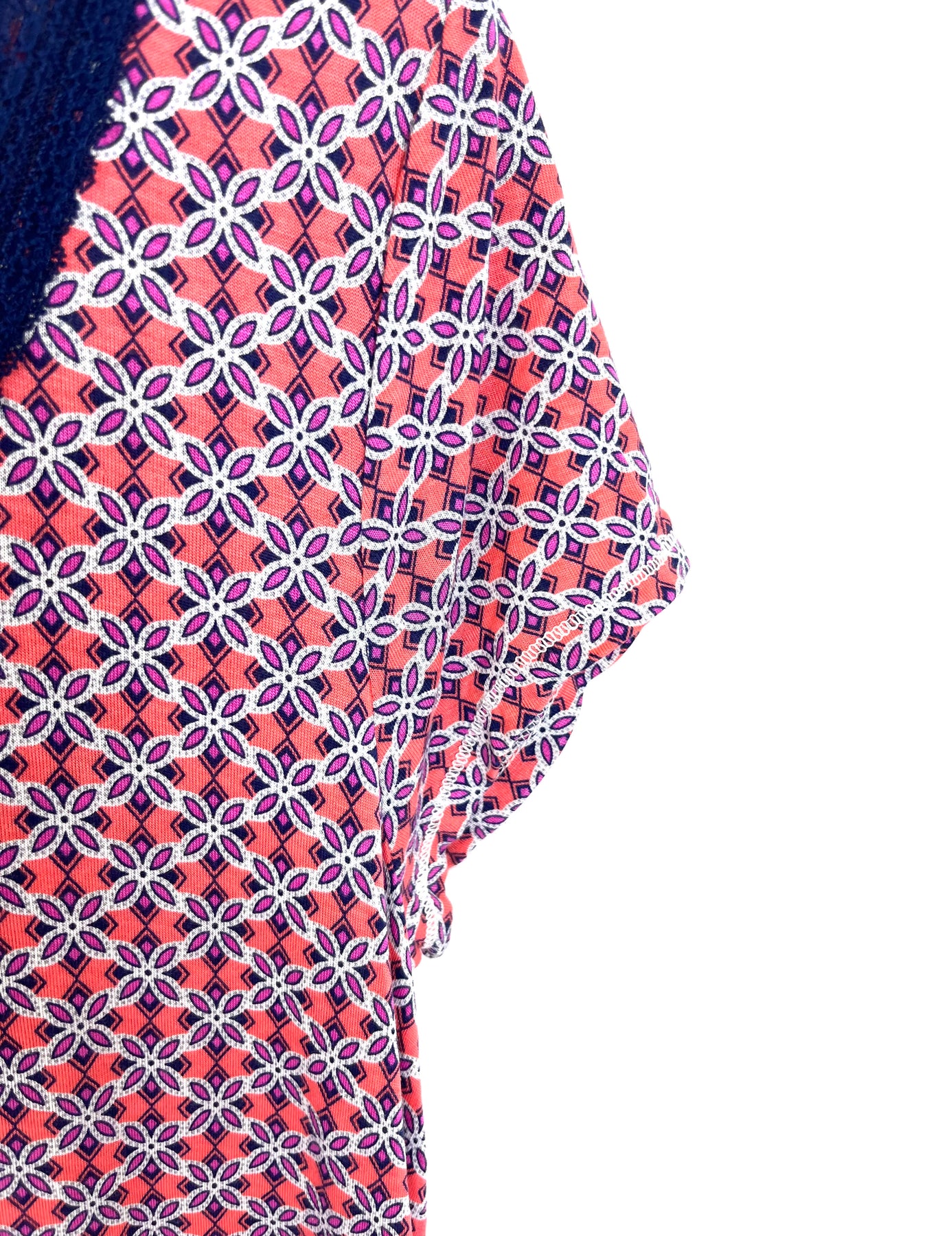 Simply Vera Vera Wang soft and stretchy, pink and orange, faux button up neckline, floral print, night gown with navy blue trim