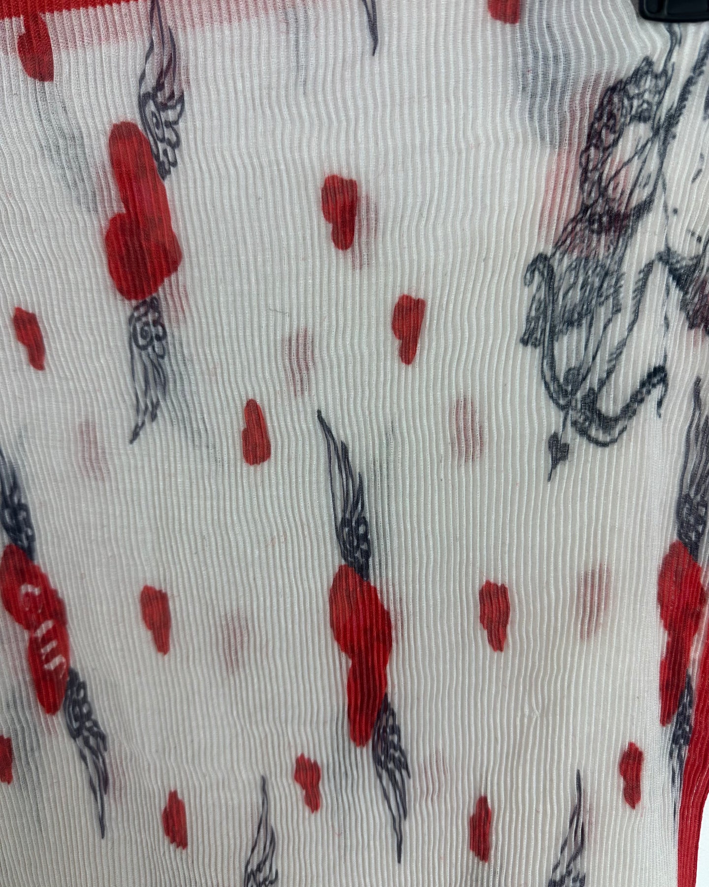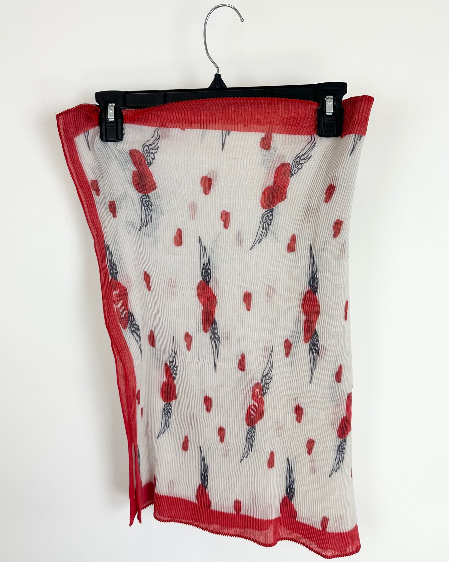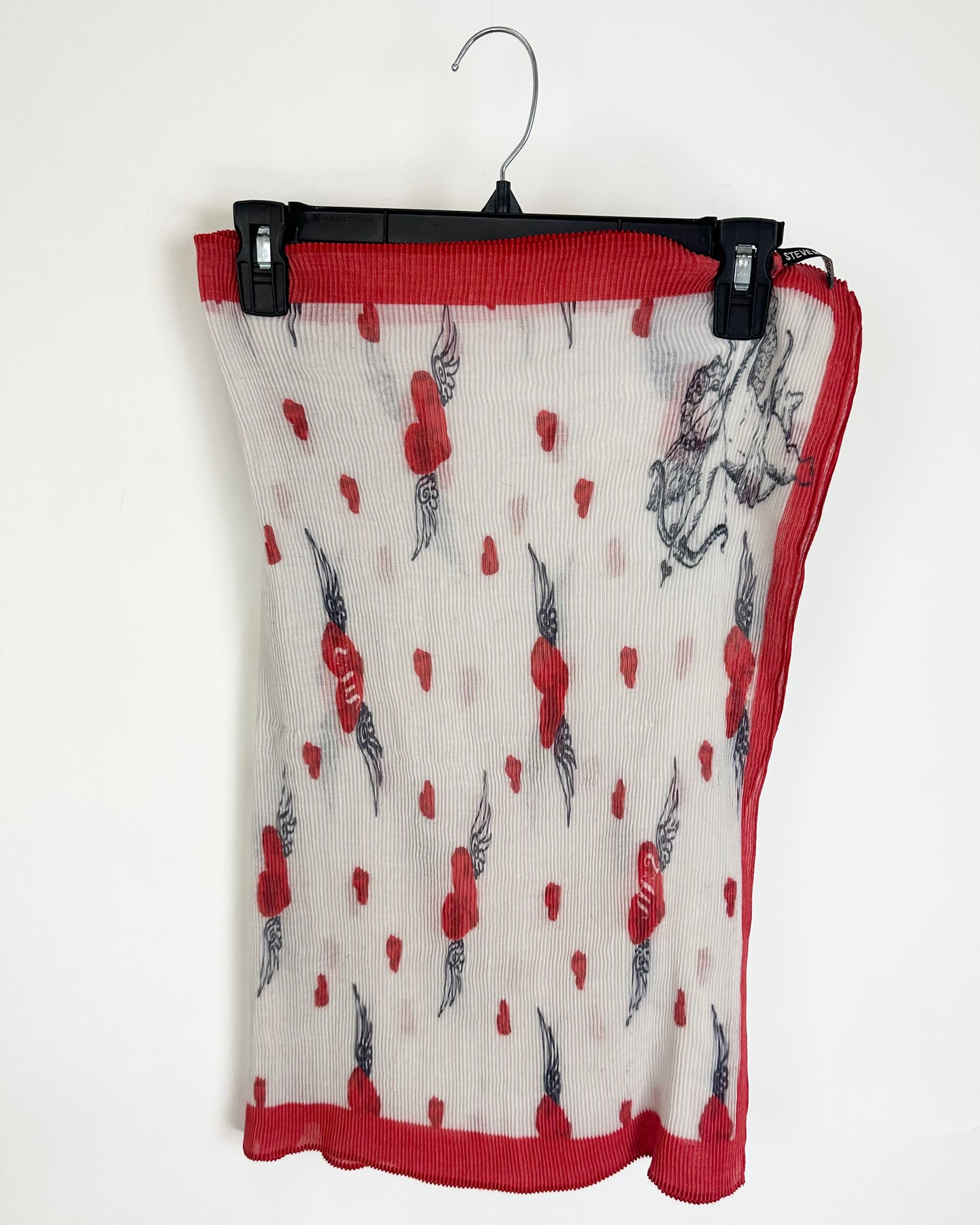 Steve Madden red flying hearts design scarf featuring cupid in the corner, red boarder along the edge and lightweight material