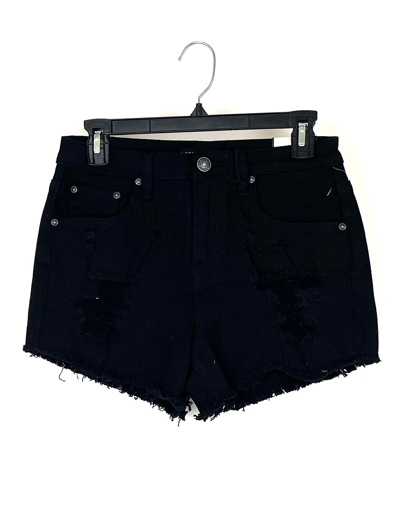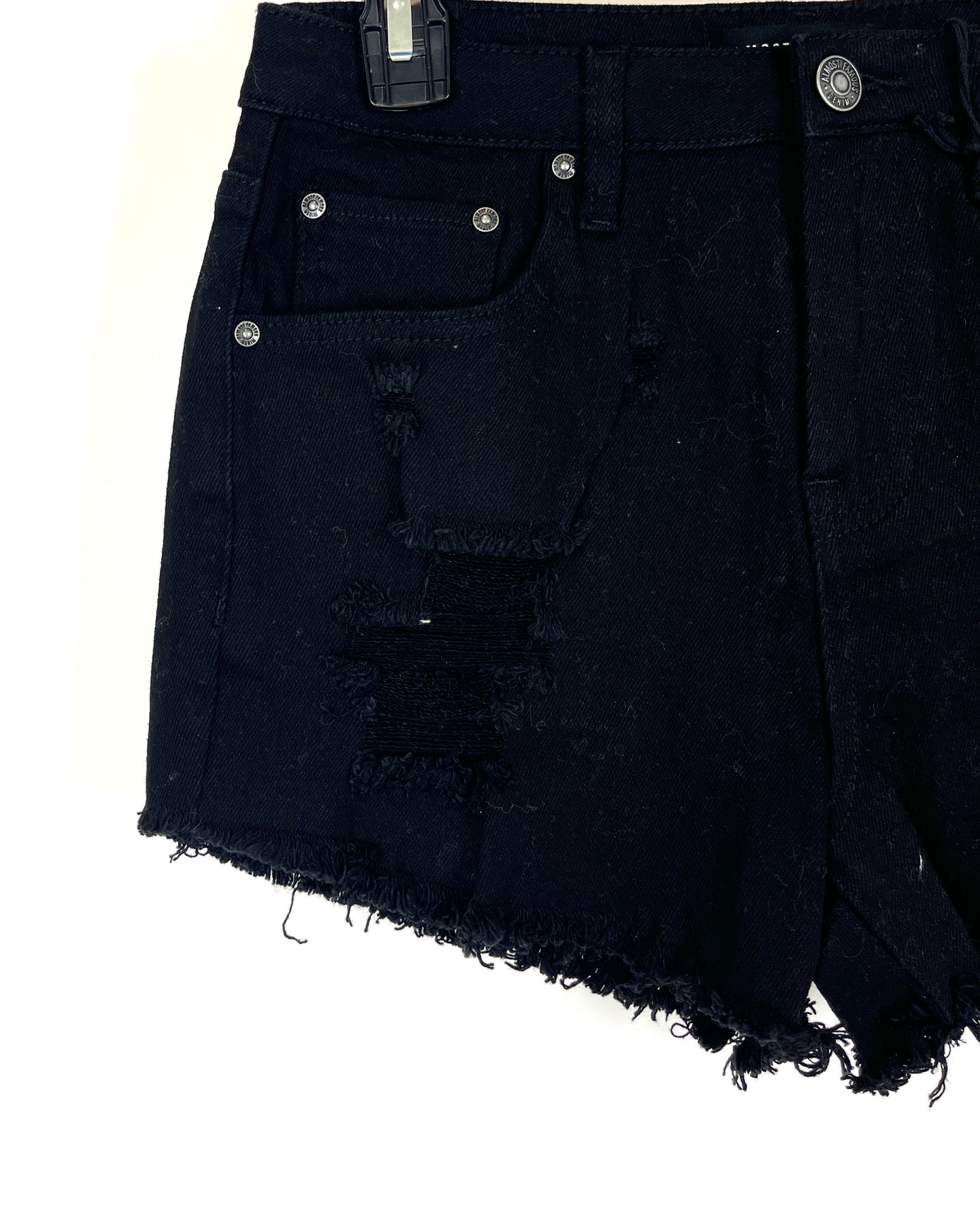 Almost Famous ripped black denim shorts with distressed hem, zipper and button closure, side pockets and distressed back pockets.