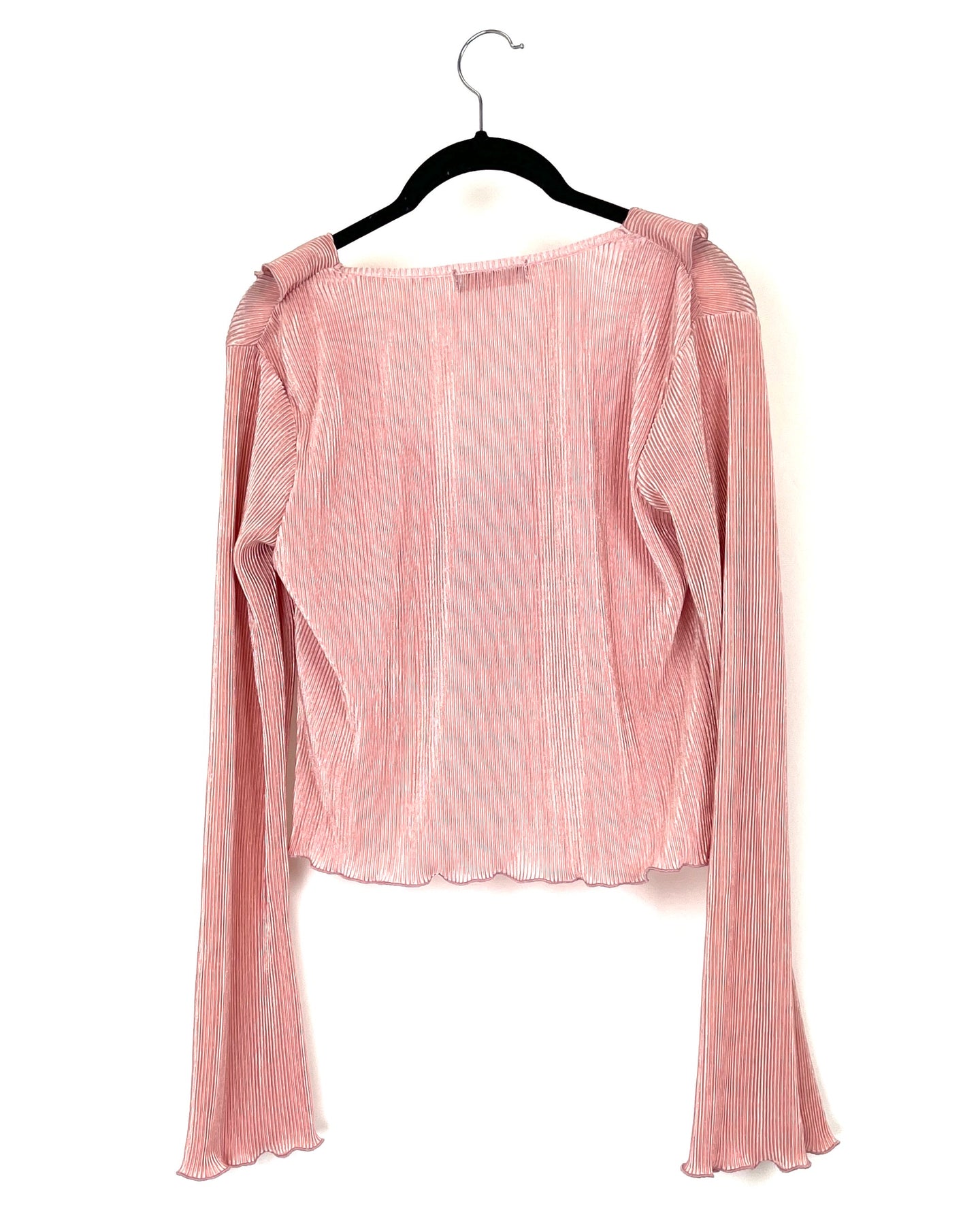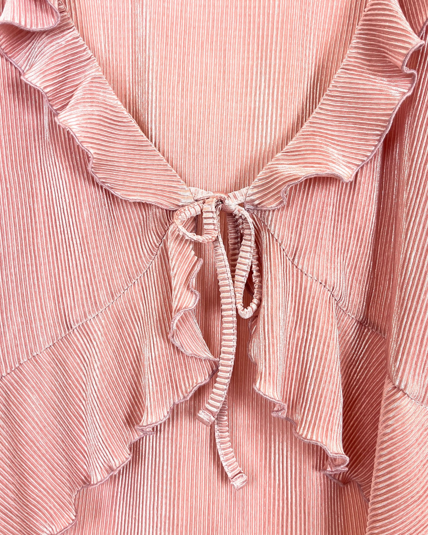 Almost Famous lightweight pink tie front in a plisse, textured fabric with long sleeves, ruffle detailing on the front, and a ruffle hem