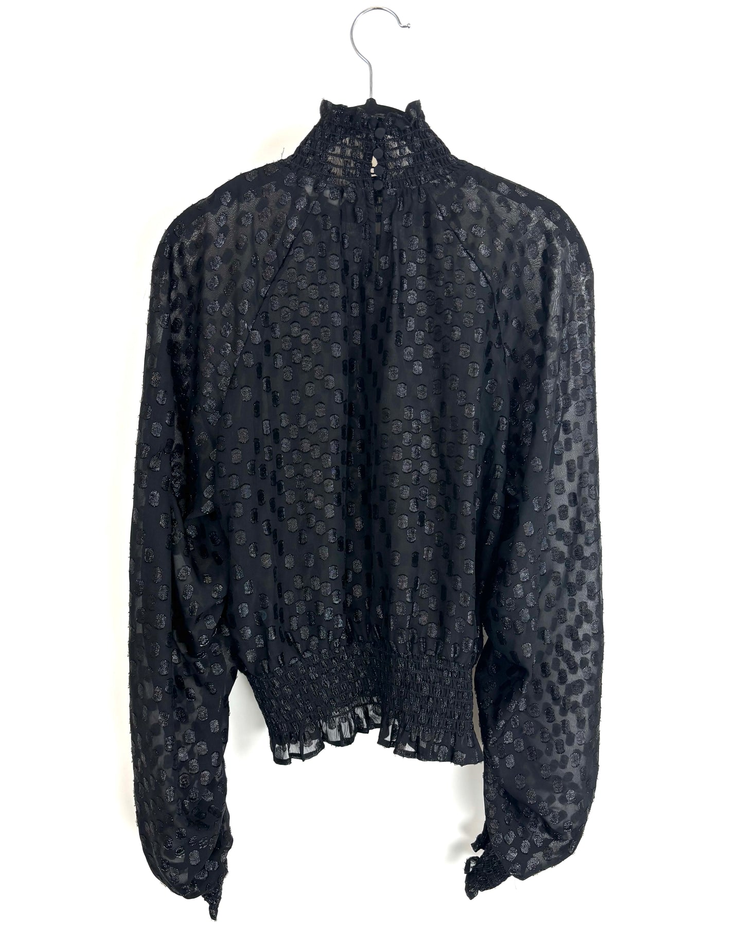 Marled blouse with long sleeves, smocked turtleneck & cuff details, 4 button closure behind the neck, and cinched at the waist in a sheer, black fabric with a metallic polka dot pattern.