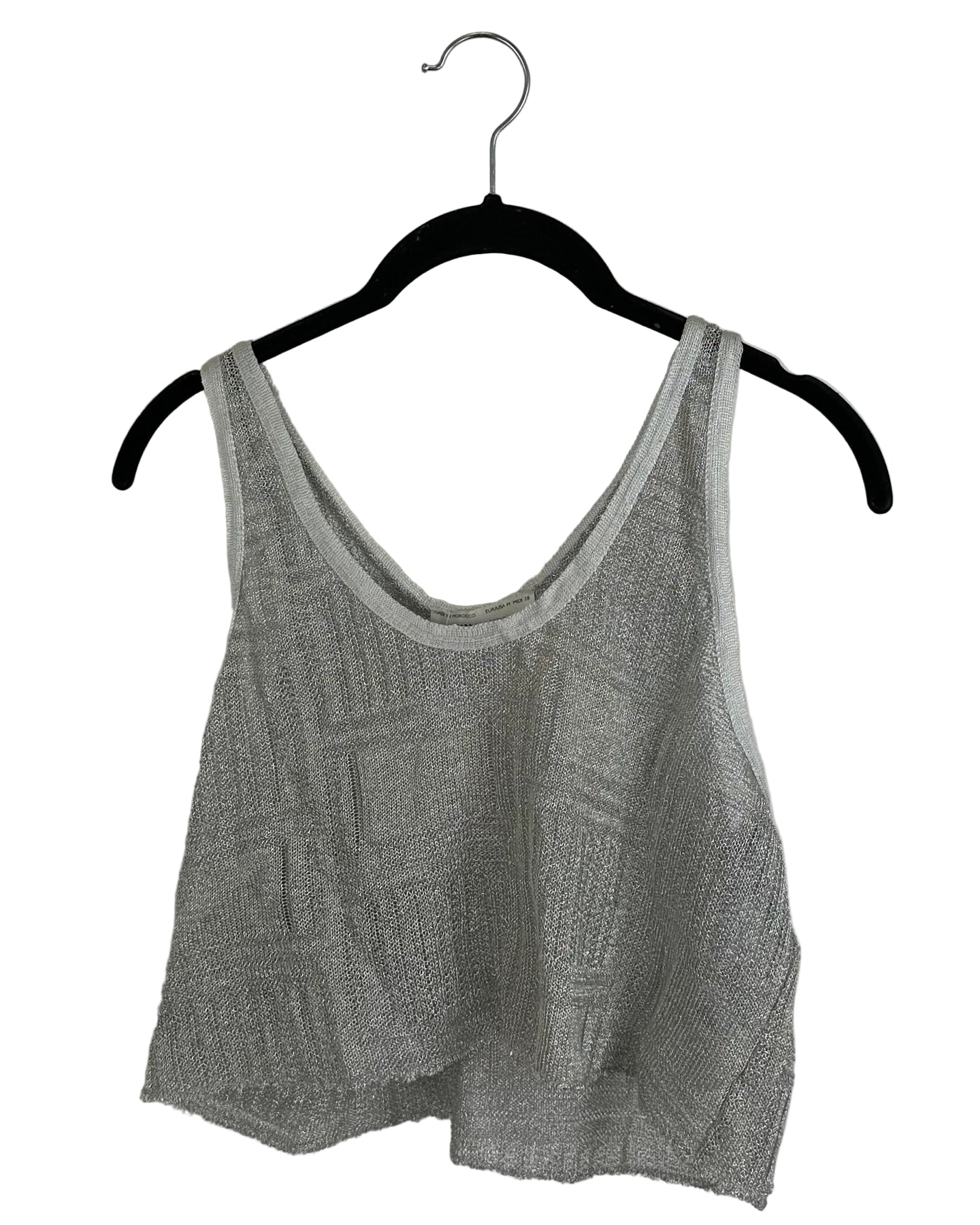 Unknown cropped tank top with crew neckline, gray piping detail at the top & sleeves, in a shimmery, silver knit fabric