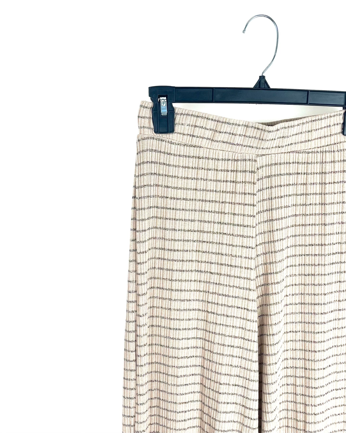 Tan ribbed flowy lounge pants with black strip print, stretchy wasitband, flowy bottom hemline with side slit