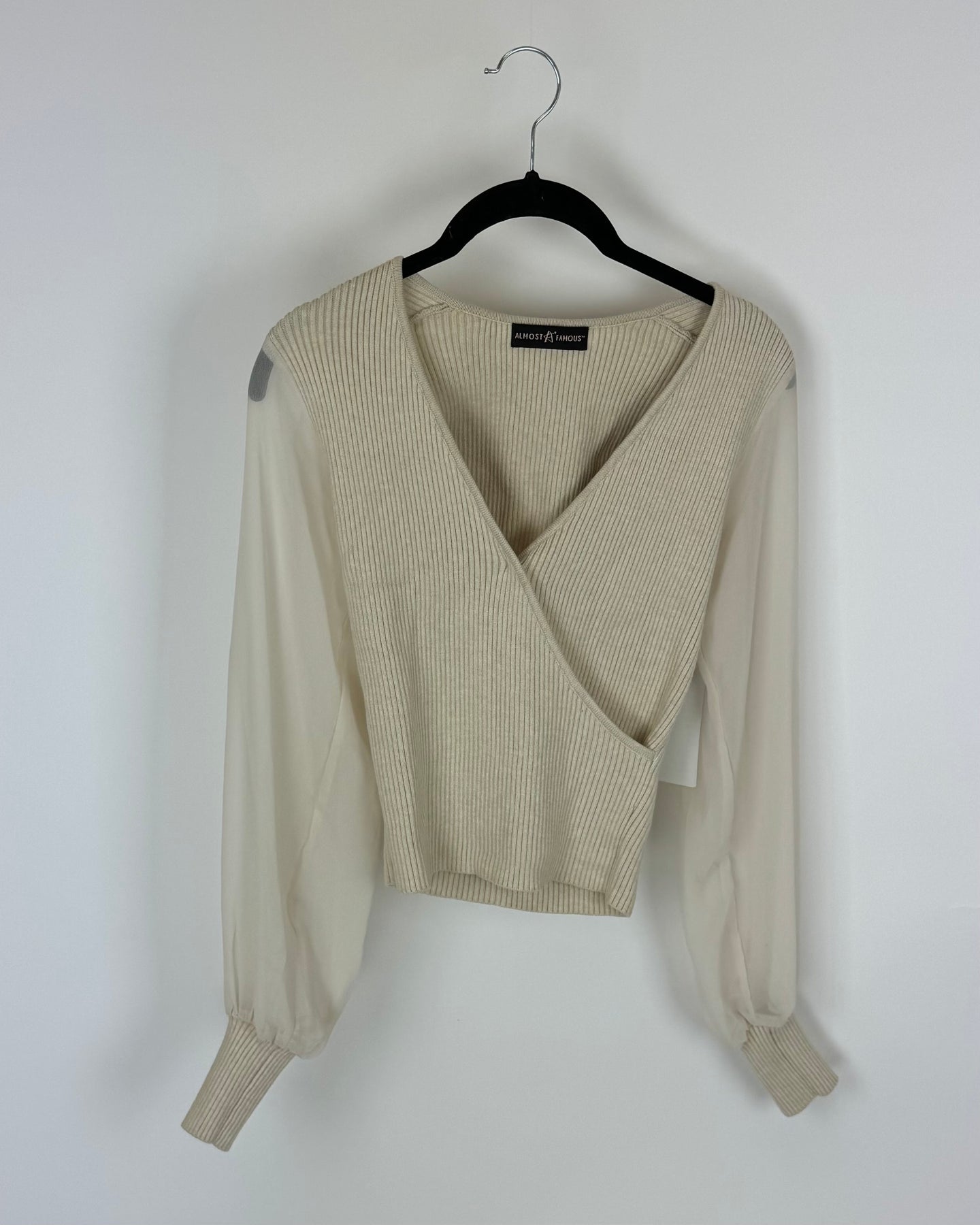 Almost Famous tan v-neck ribbed cross wrap shirt with mesh long sleeves with a ribbed hem