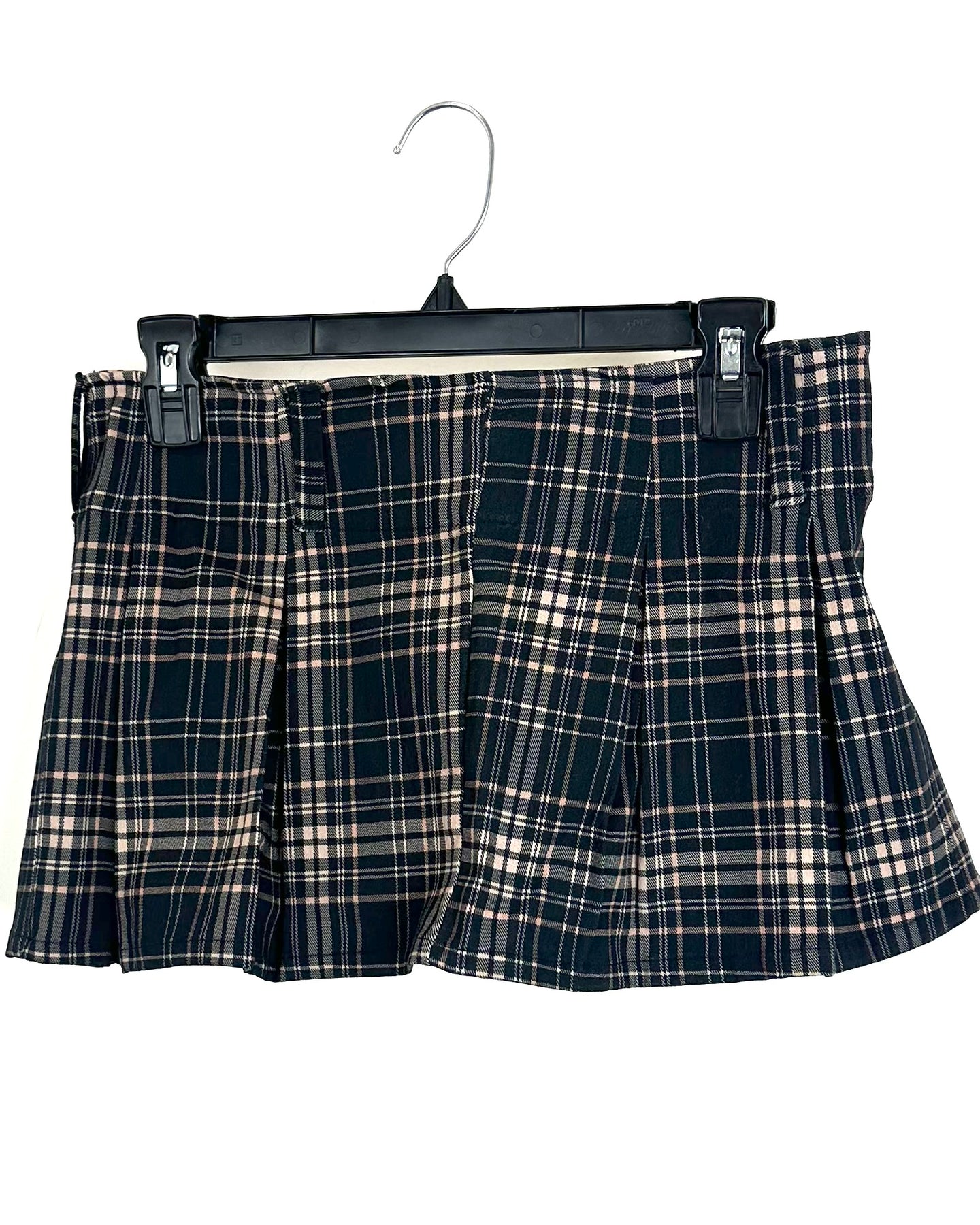 Almost Famous ultra mini black and brown plaid skort in a stretchy fabric with pleats, belt loops,  built in interior shorts and side zipper closure
