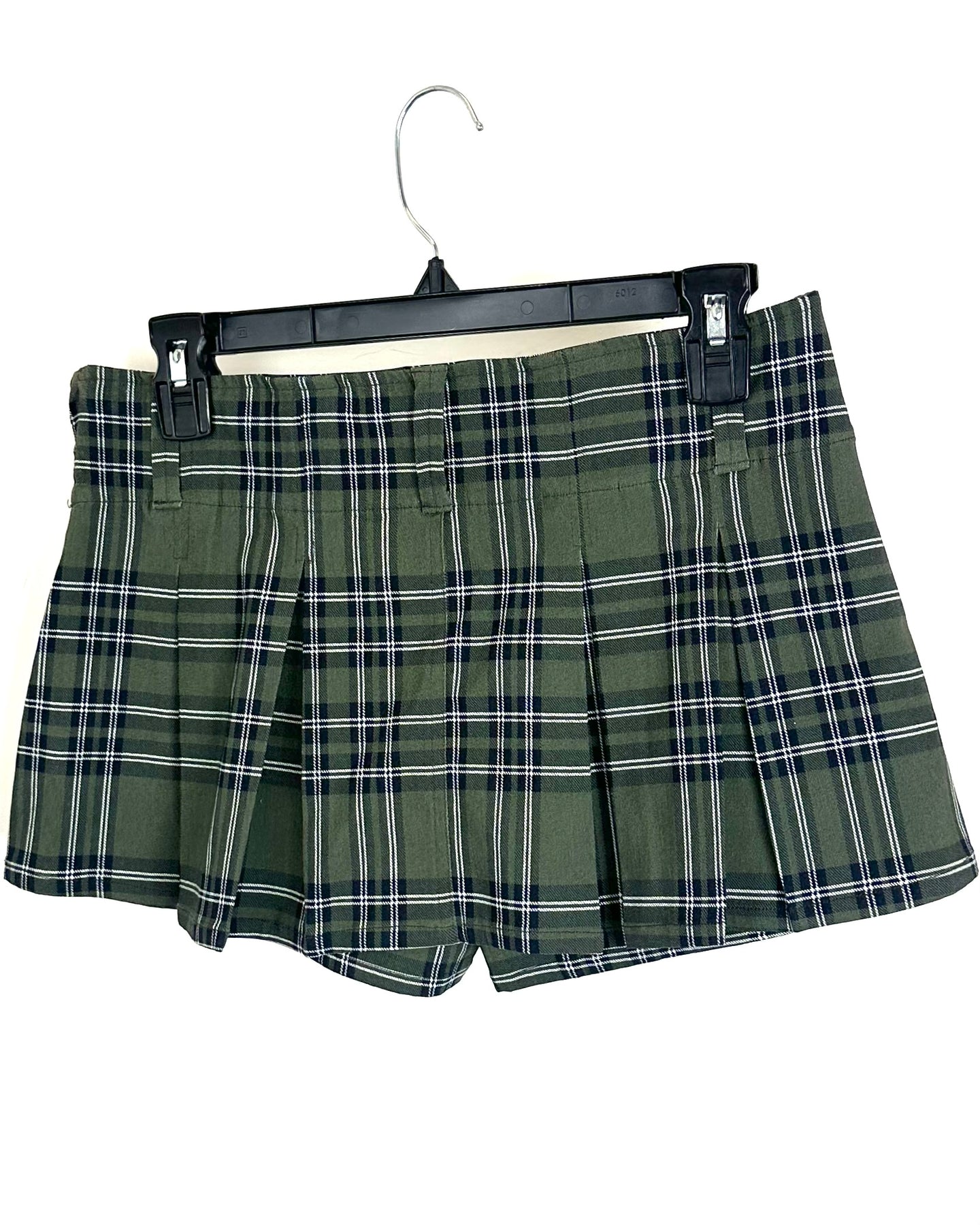 Almost Famous green, black and white plaid ultra mini skort in a stretchy fabric with pleats, belt loops,  built in interior shorts, non-removable belt and side zipper closure