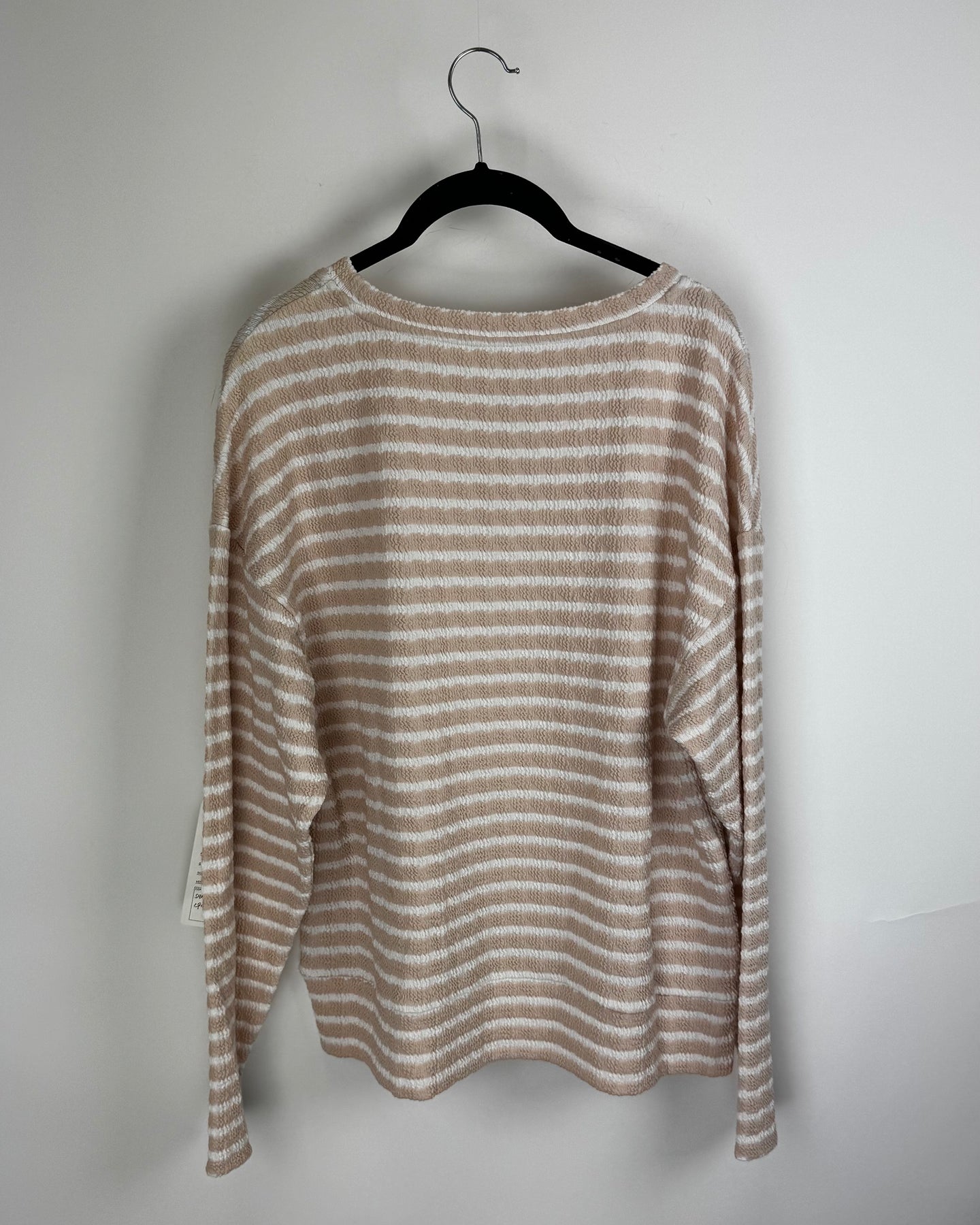 White and Sand Brown striped long-sleeve shirt with a crew neckline and textured fabric