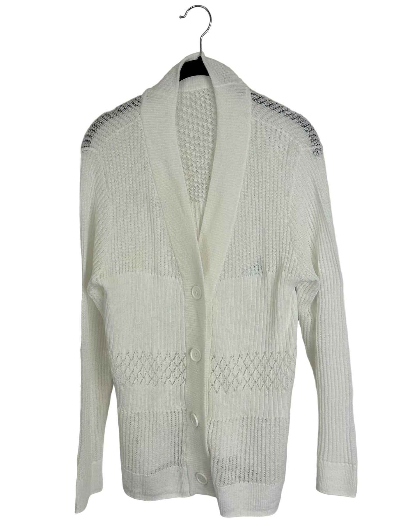 Reunited Clothing sweater with long sleeves, deep v-neckline, 4 button closure down the front in a lightweight, white knit fabric.