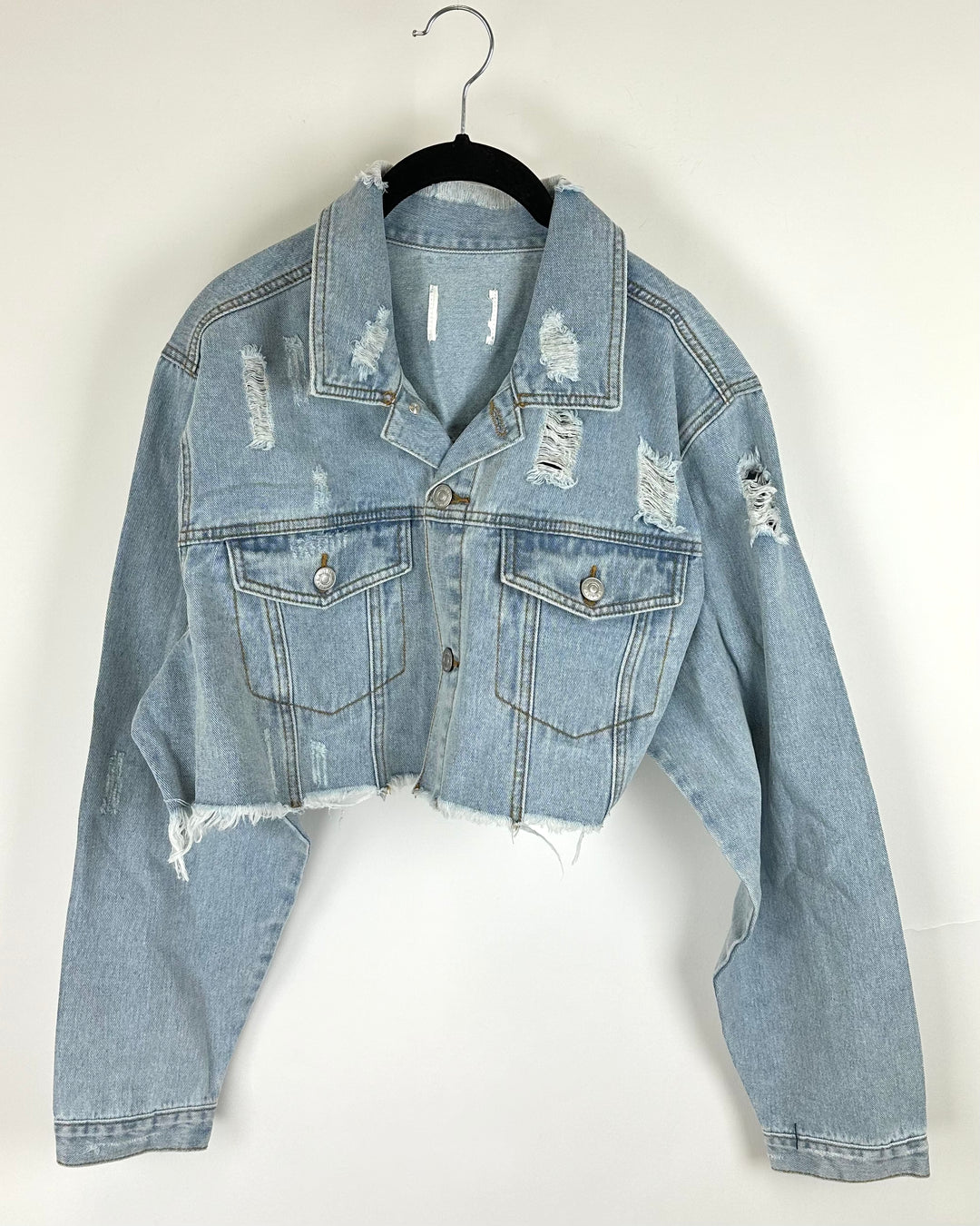 Light Wash Distressed Cropped Denim Jacket - 2X