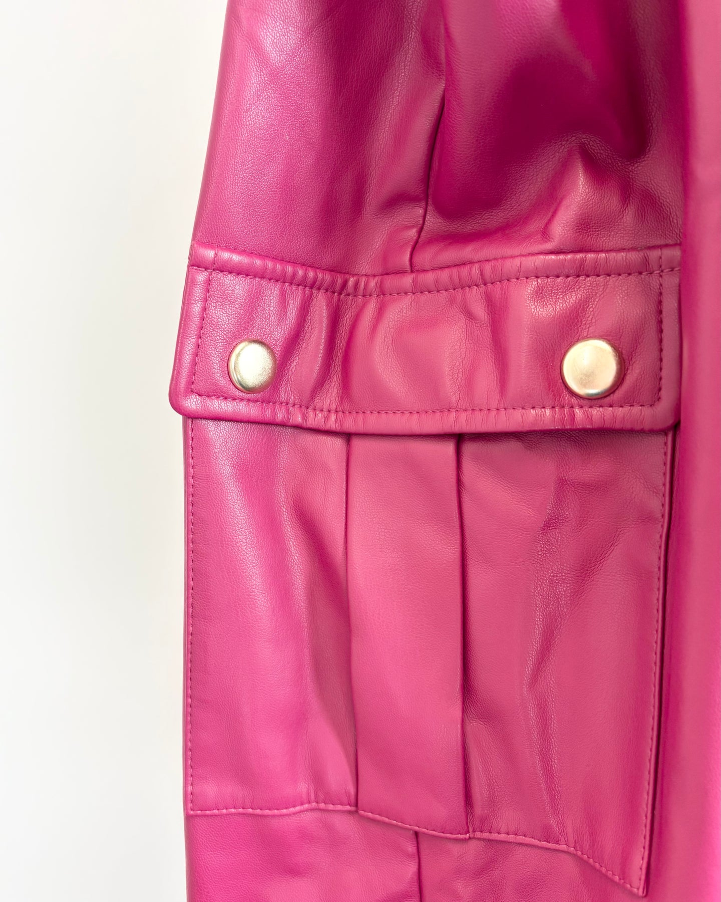 Nina Parker magenta pink faux leather cargo joggers with hook button closure, front pockets and cargo pockets on each side in a soft, stretchy fabric