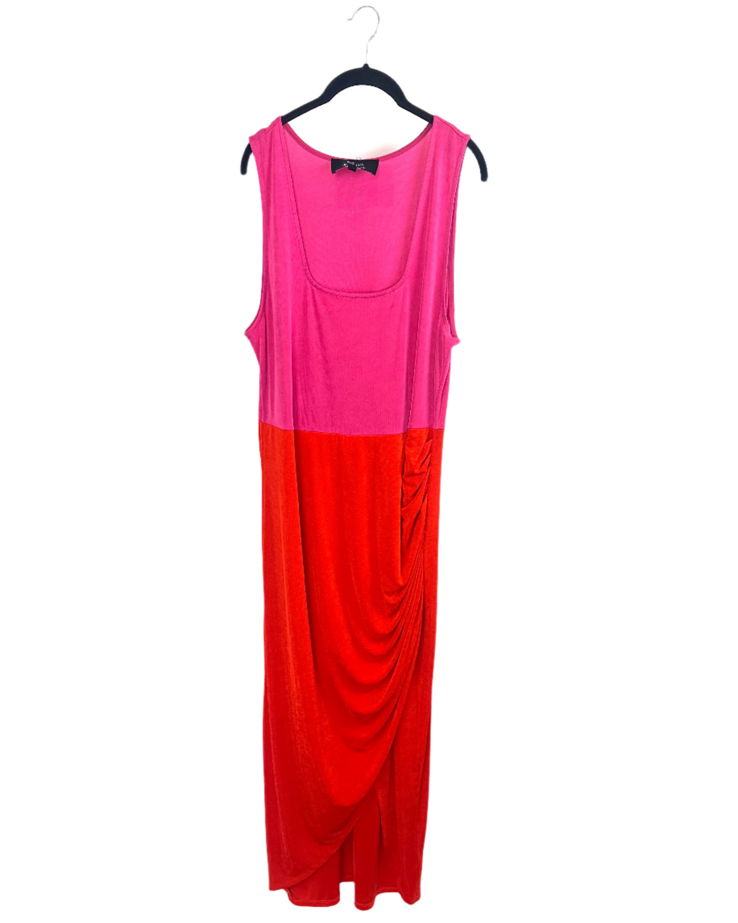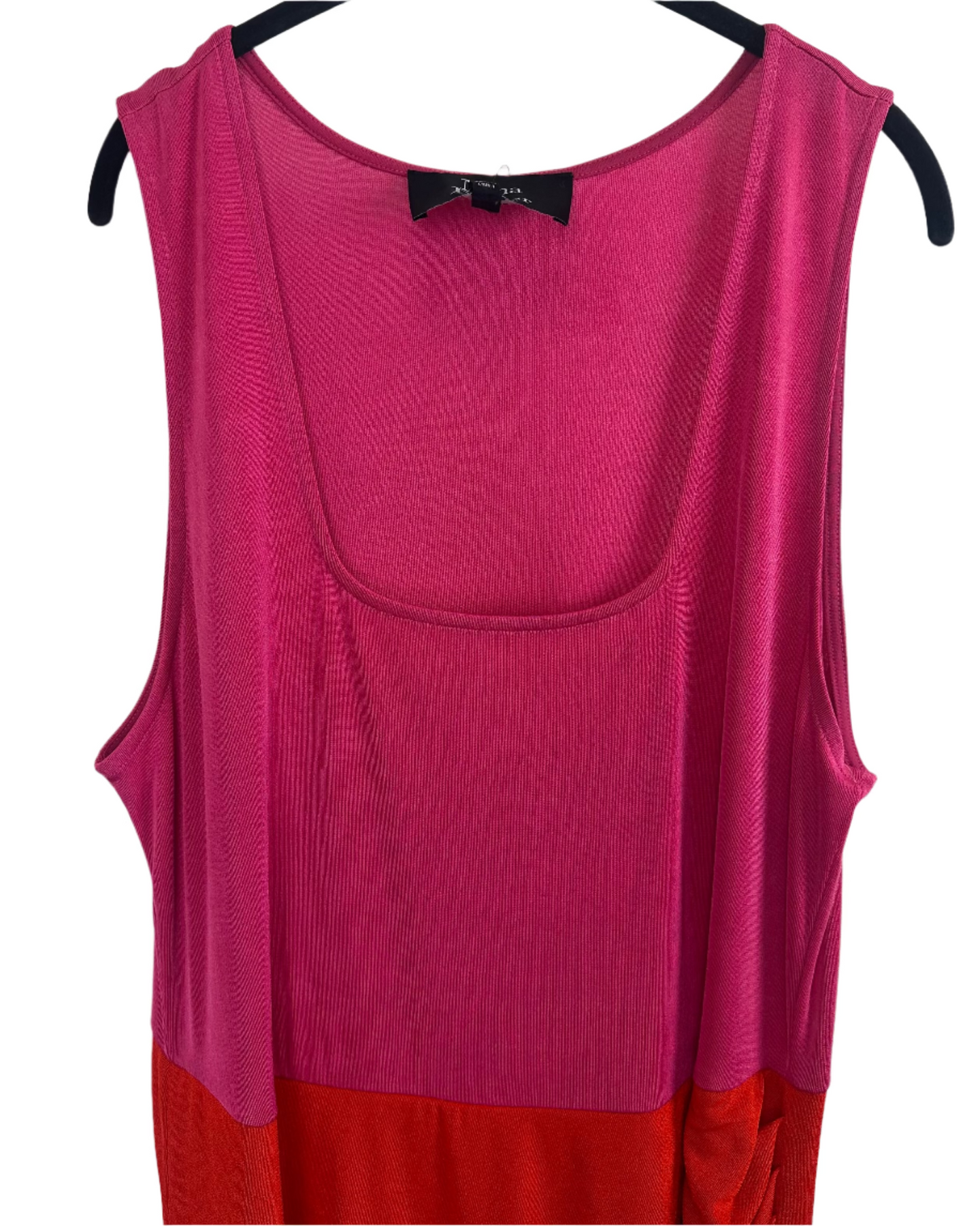 Nina Parker orange and pink tank top dress with ruched detailing going up the front right side, mesh like look, low neck cut, slit on the bottom right front side, stretchy, comfortable and soft