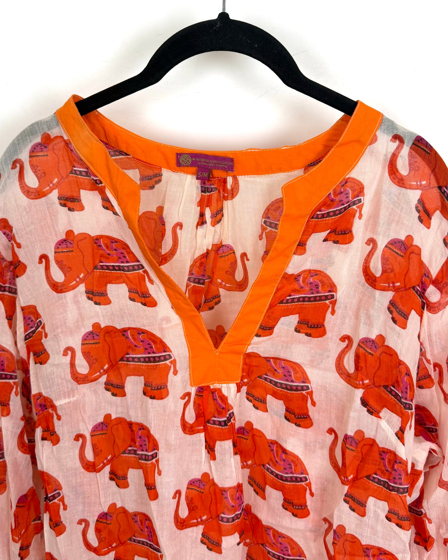 Orange elephant patterned top with a v neckline and cropped sleeves in a sheer lightweight fabric