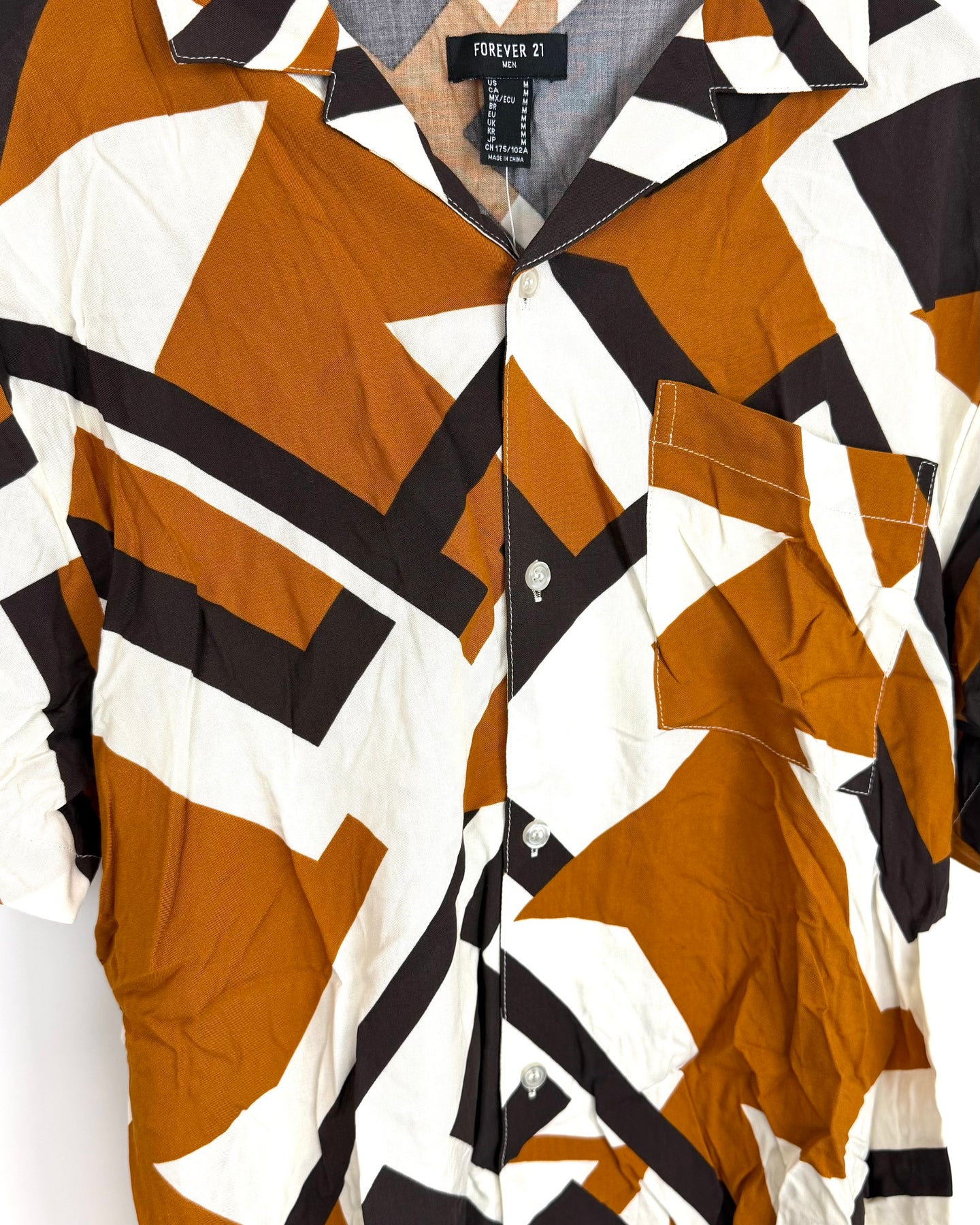 Forever 21 men's orange, white and brown abstract short-sleeve button-up top, with a classic V neck collar, front button closure with white pearl-like buttons, one chest pocket, in a relaxed, lightweight fabric