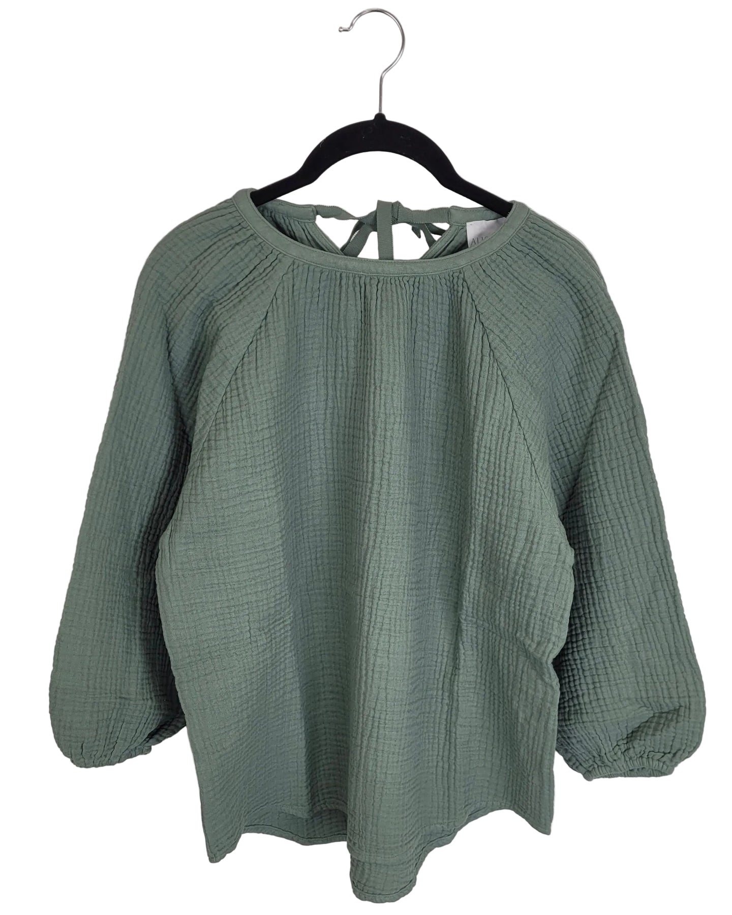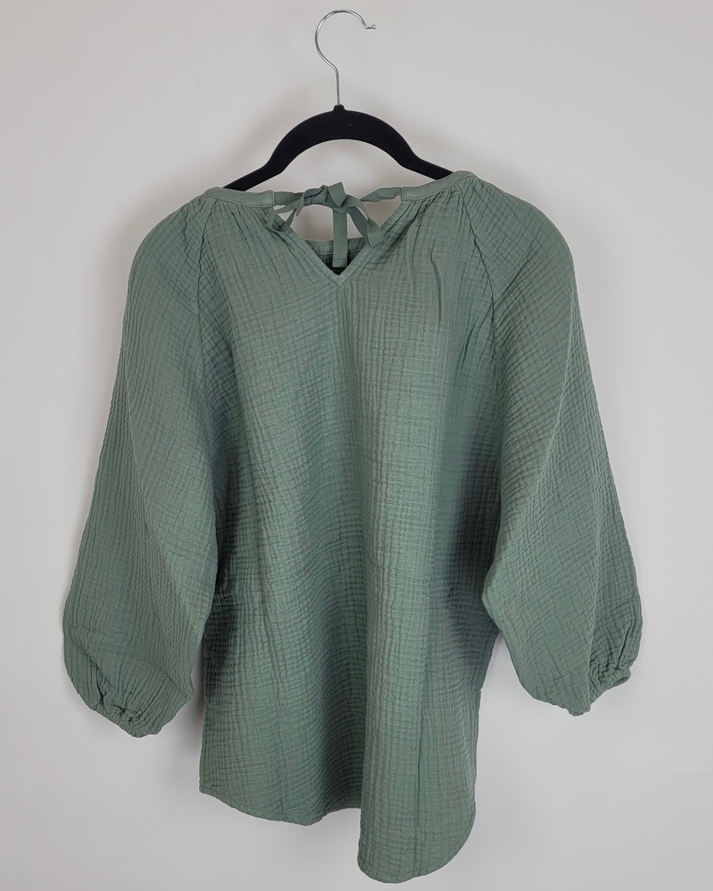 Alice Walk muted green textured top with cropped sleeves, cuffed elastic sleeves, crew neckline with piping trim and adjustable tie back neckline in a pullover relaxed silhouette