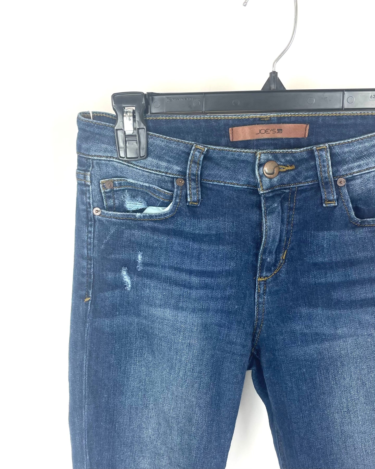 Joe's mid-rise dark wash skinny jeans, with small rips at knee and frayed ankle hem, front and back pockets and zipper and button closure.