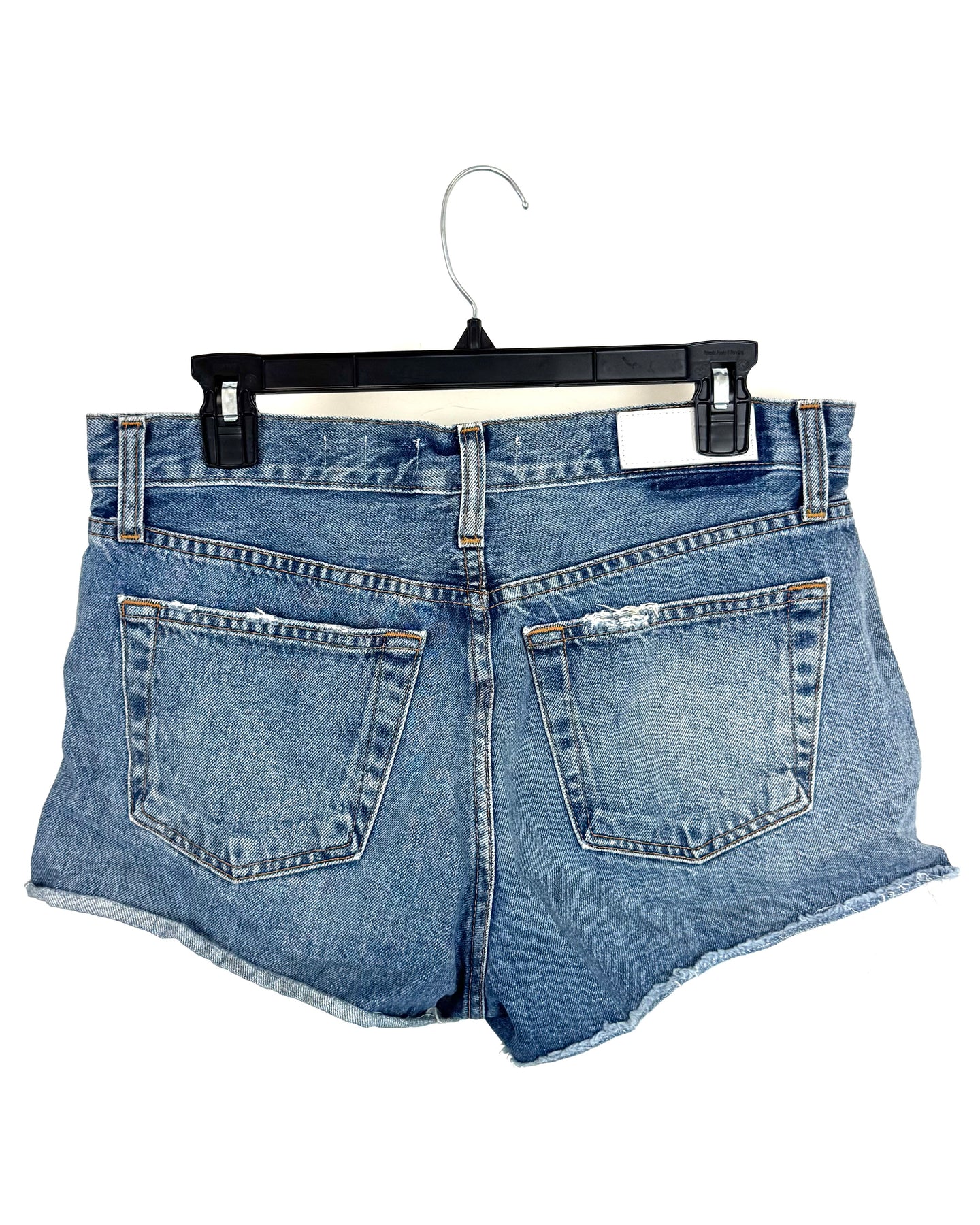 Re/done medium wash denim shorts with two side pockets, two back pockets, distressed rips, belt loops, a silver button, and a zipper to close