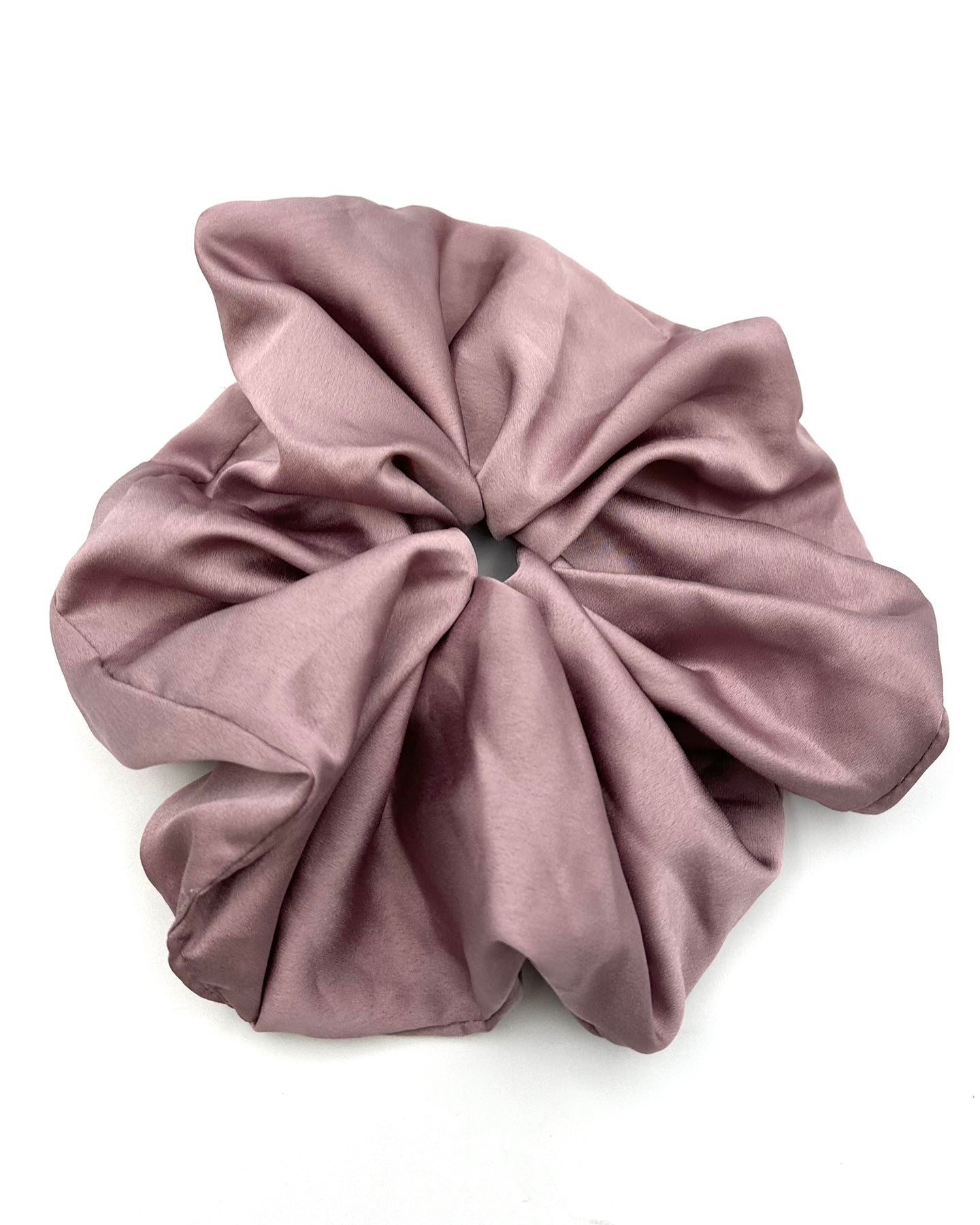 Light mauve oversized jumbo scrunchie made from lightweight, satin-like material.