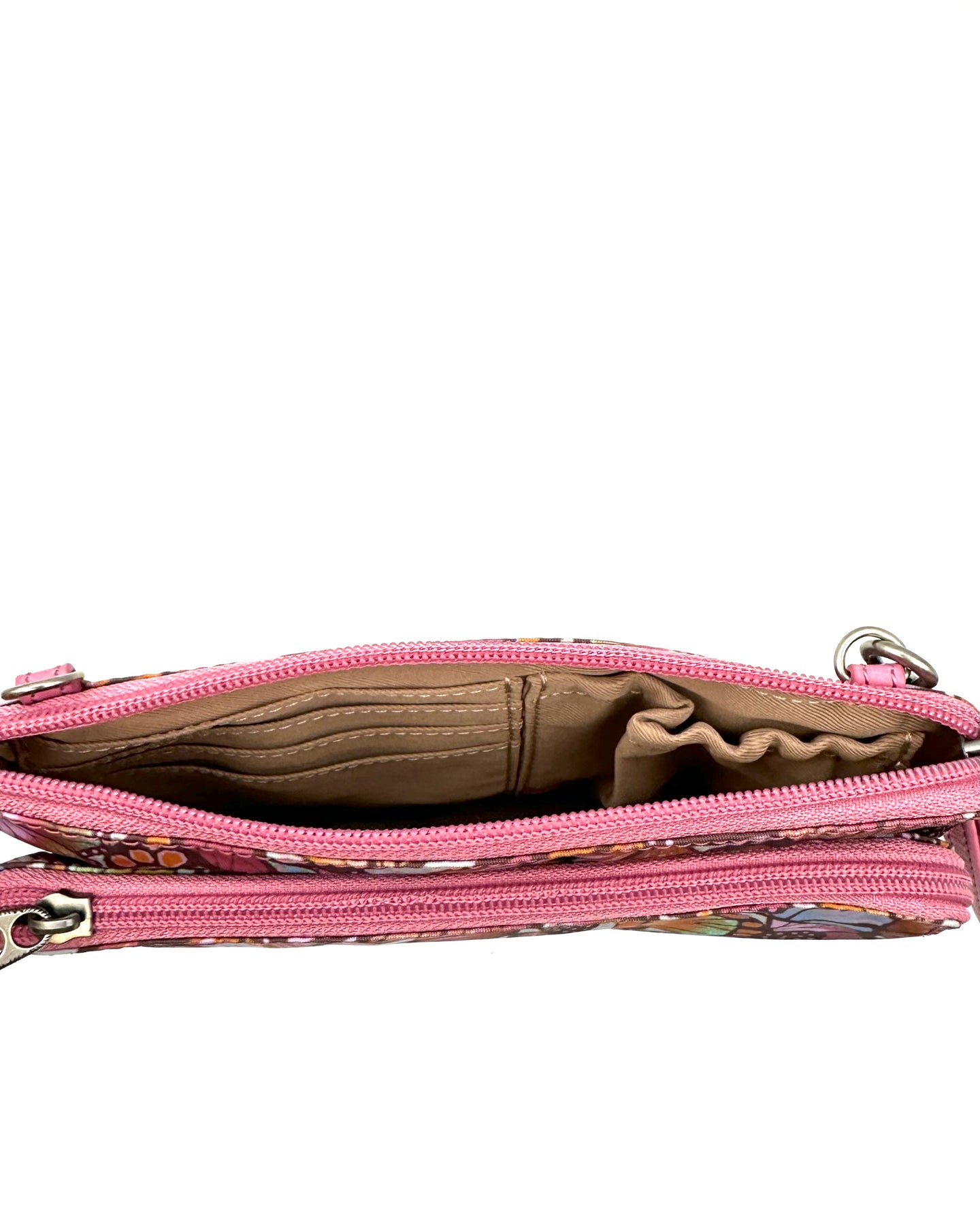 The Sak pink crossbody bag with multicolor butterly motif print pattern, silver hardware, main zipper closure with additional front zipper closure pouch, beige lined interior with inner and card slot pockets, with detachable leather wristlet and detachable adjustable leather crossbody strap