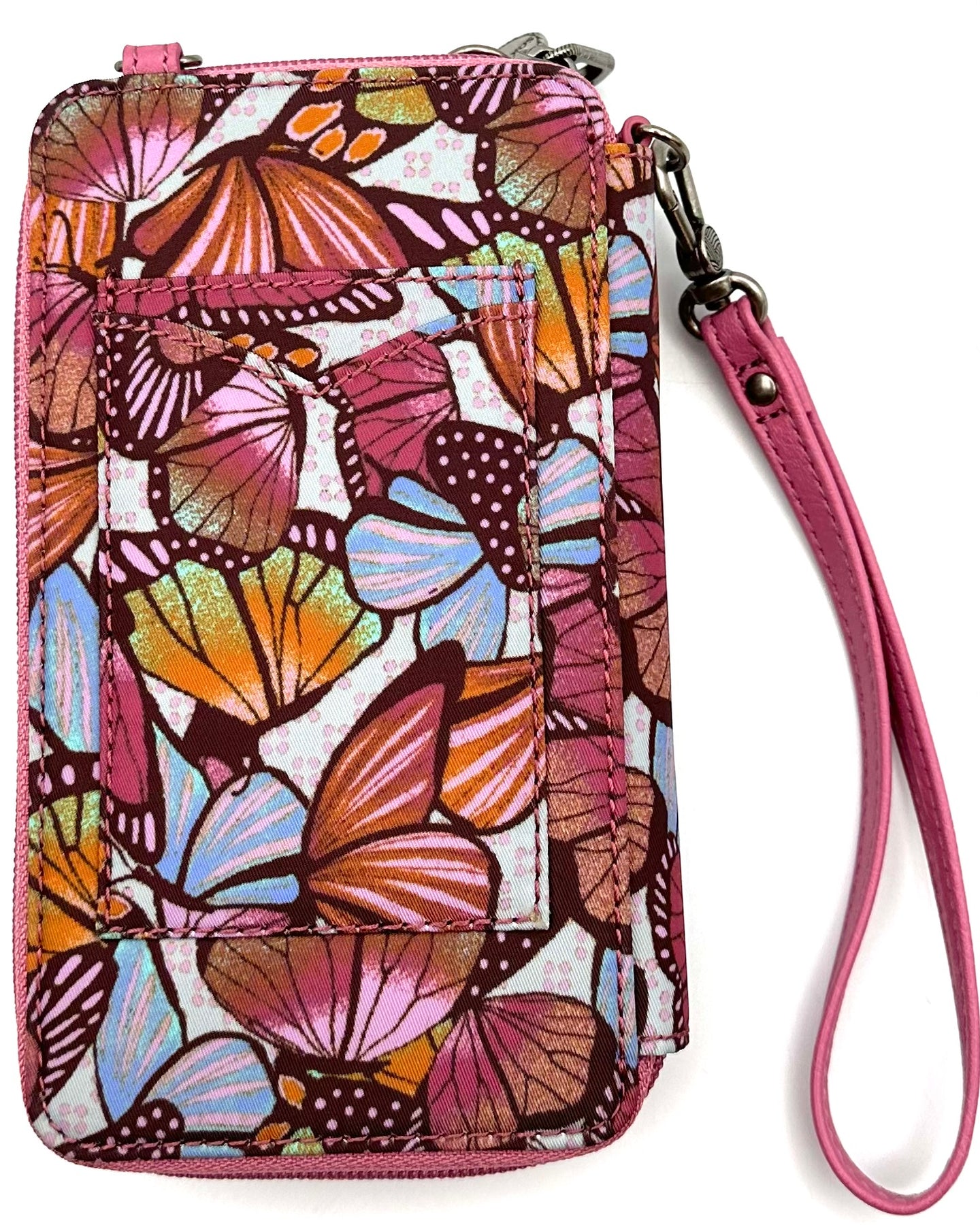 The Sak pink wallet/wristlet/crossbody bag with multicolor butterly motif print pattern, silver hardware, main zipper closure with front snap closure pouch, butterfly print interior with multiple card slots, transparent window pocket, and back card slots with detachable leather wristlet and detachable adjustable leather crossbody strap