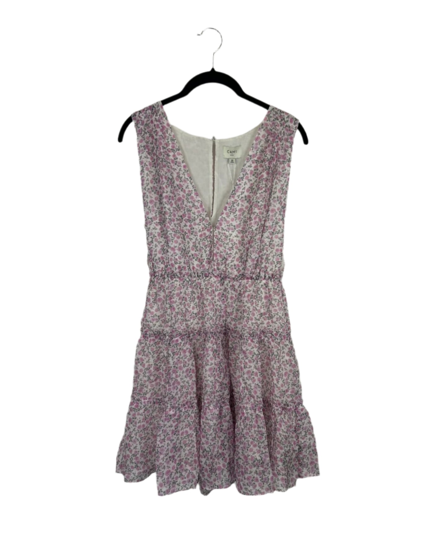 Cami NYC deep V-neckline pink floral tank dress with three tier ruffles, button closure at the back of neckline, metal hook closure at chest and underarm, lined with white slip, and elastic band at waist.