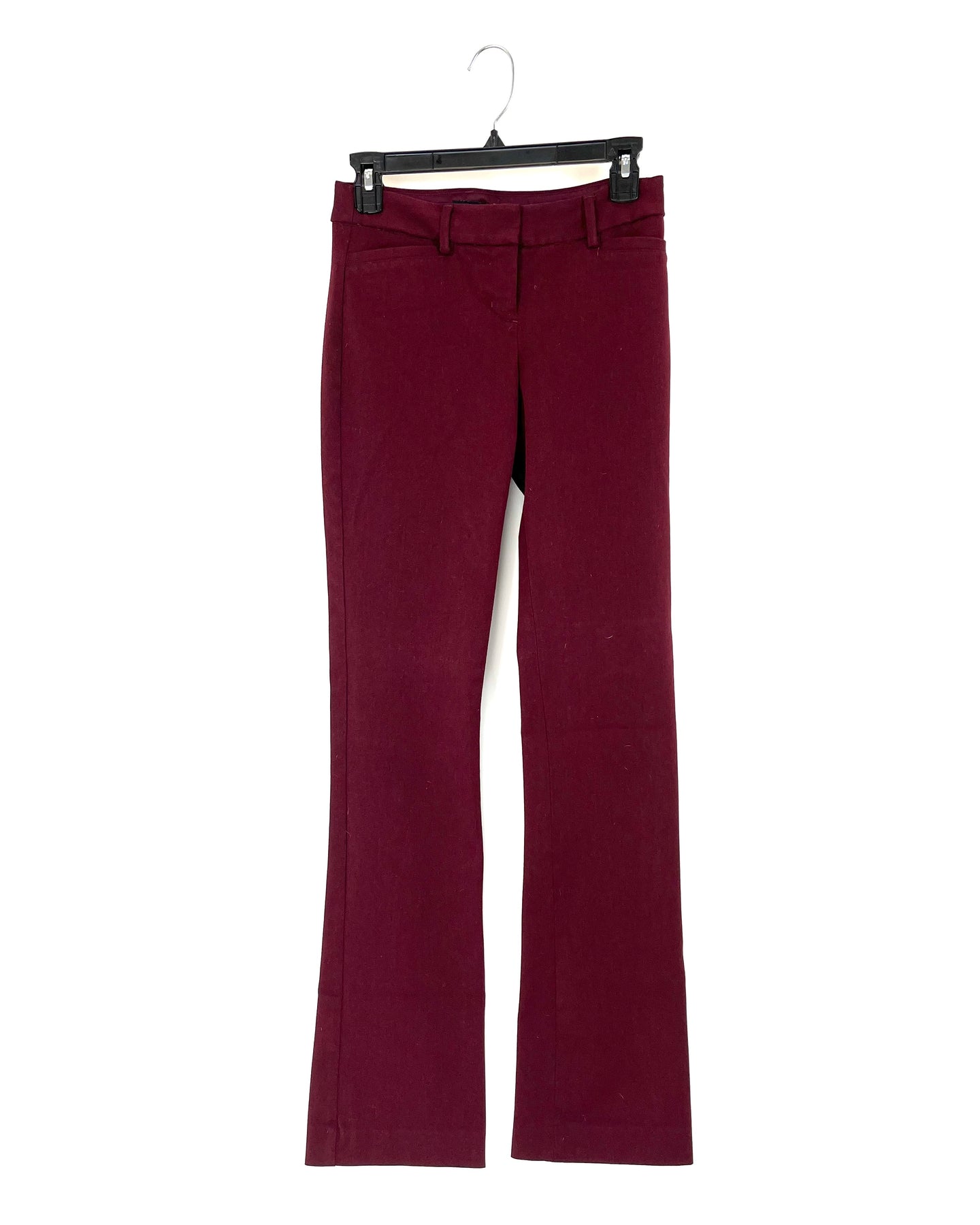 Express deep heather red low waist trousers with a straight leg, front and back pockets, belt loops and a front zipper and hook closure in a slightly stretchy fabric