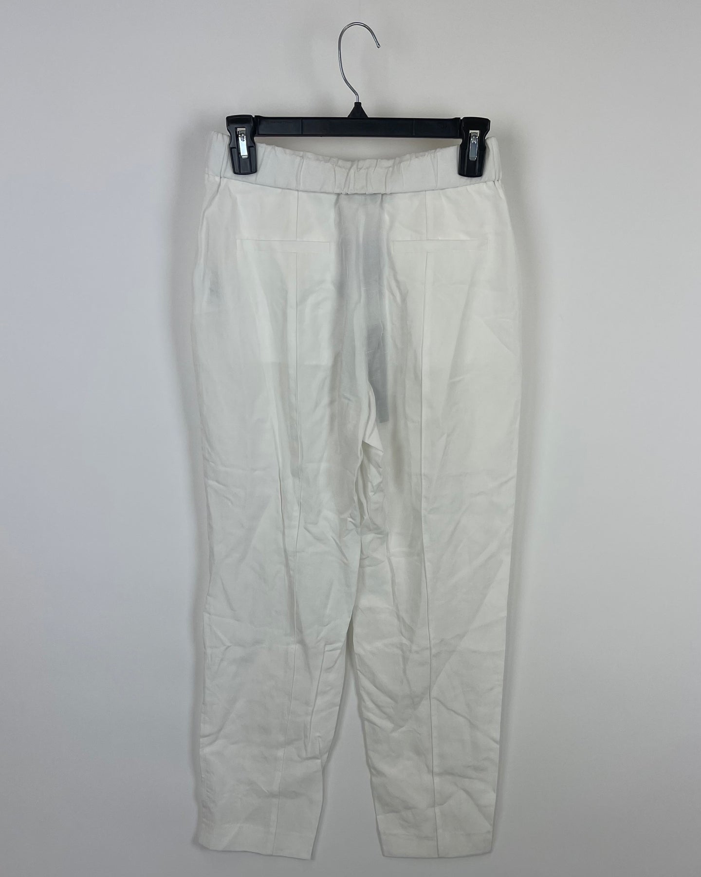 Kobi Halperin white, slightly sheer, tailored pants with an elastic waistband, hook and eye and zipper closure on the front, two front pockets, and faux back pockets.