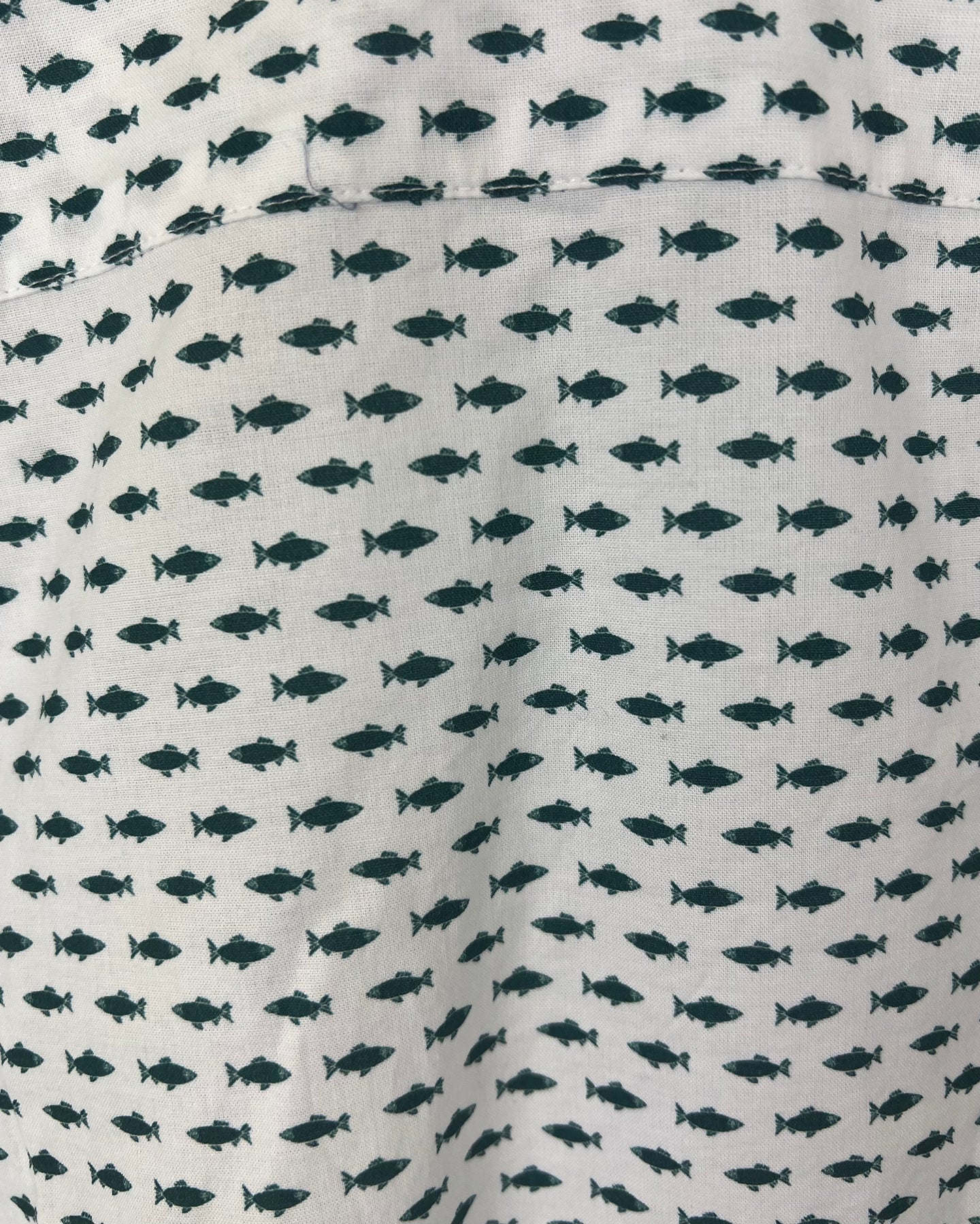 MENS Bonobos white, slim fit, collared, buttoned down shirt with short sleeves and a blue fish pattern