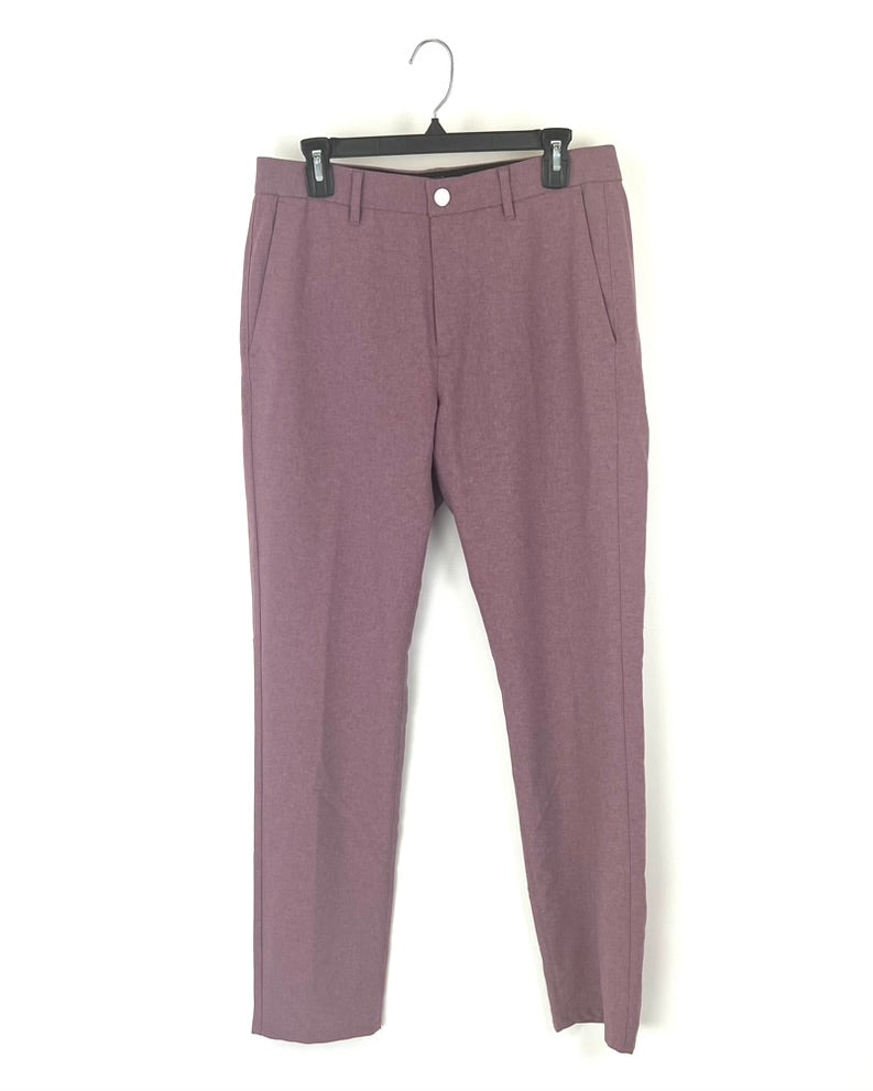 MENS Bonobos heathered light merlot golf pants, button and zippered front, belt loops, front and back pockets, zippered right pocket on back, Bonobos logo on back. Available in straight, athletic, slim taper, slim fit.