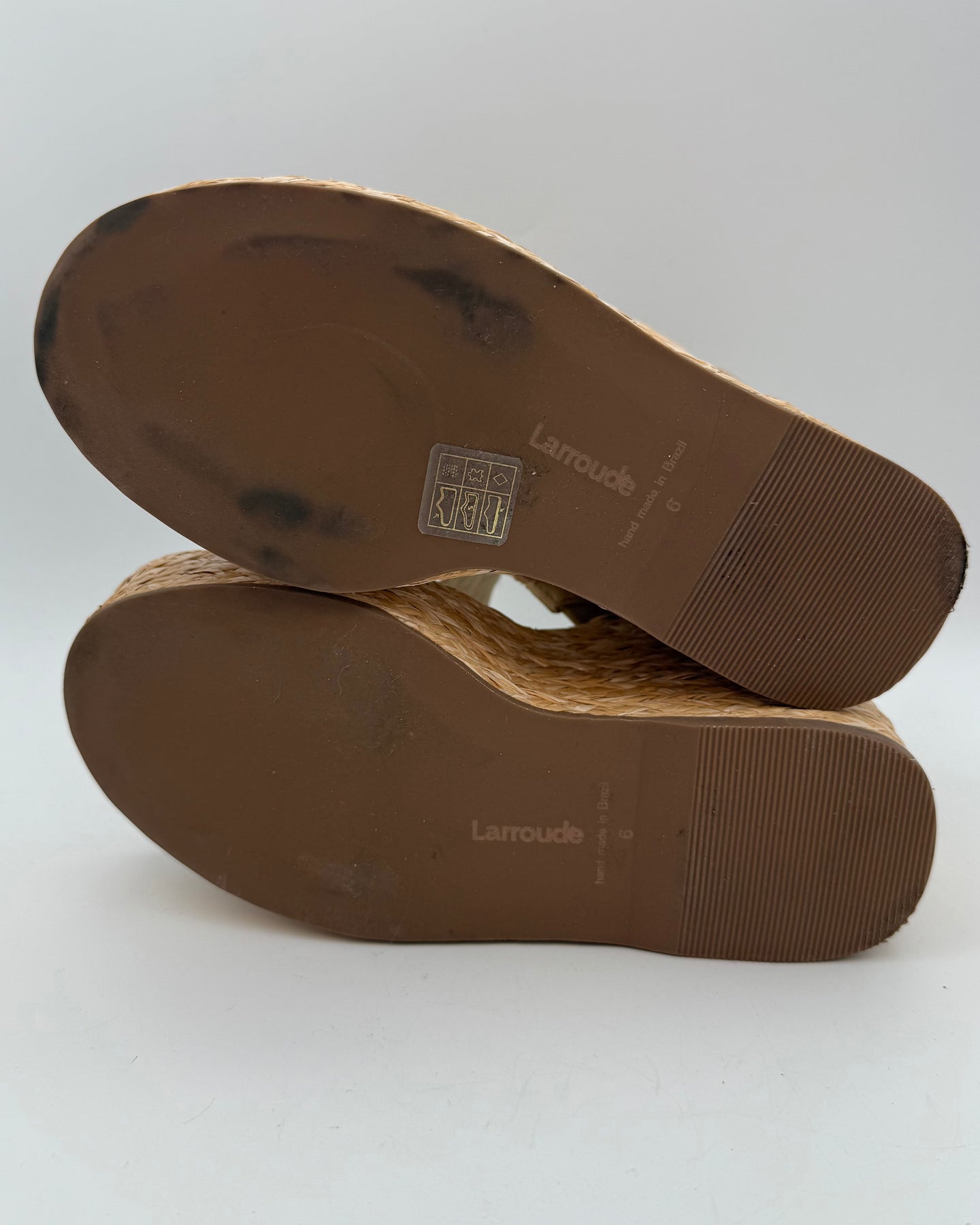 Larroude almond beige sandals, raffia material, platform wedge style with rounded open toe, two wide support straps, and rubber sole.