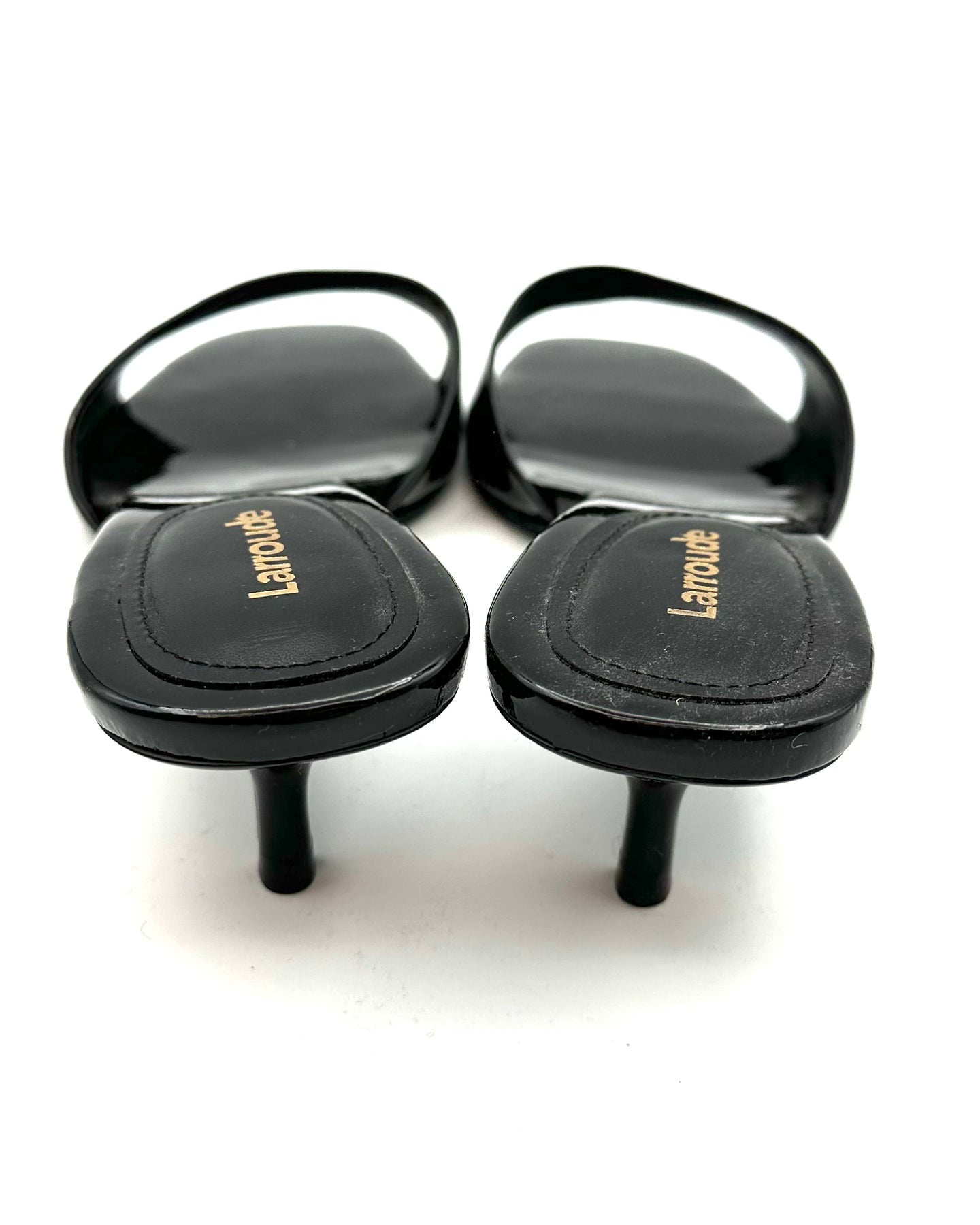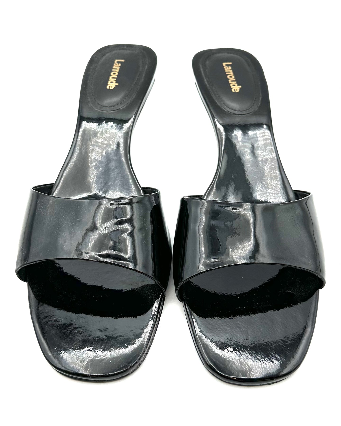 Larroudé black patent leather mule with strap, mini heel, and open round toe. Please note, slight scuff marks on bottom of shoe most likely from photoshoots but shoe is brand new.