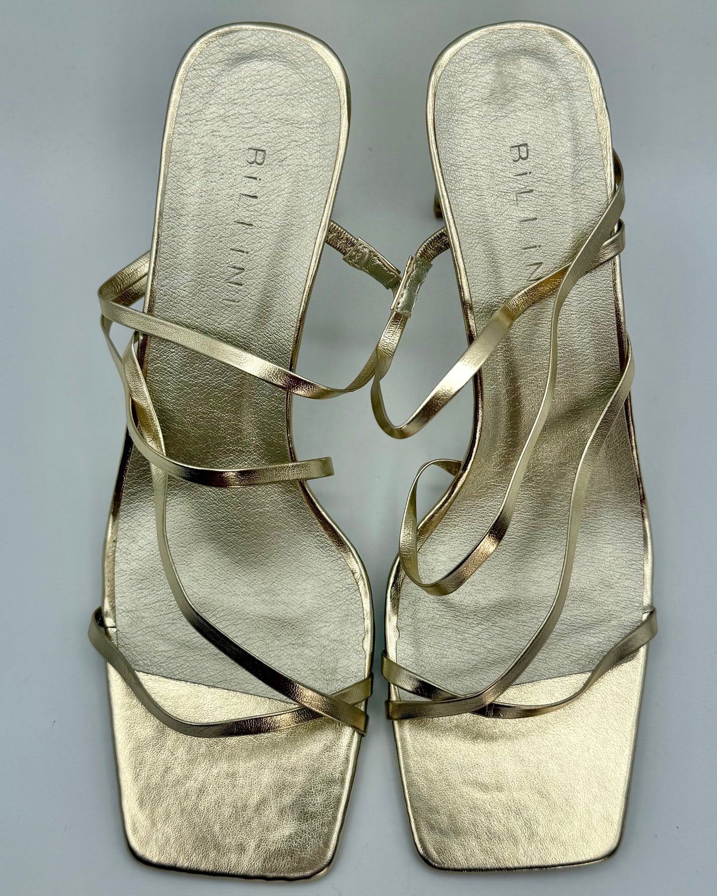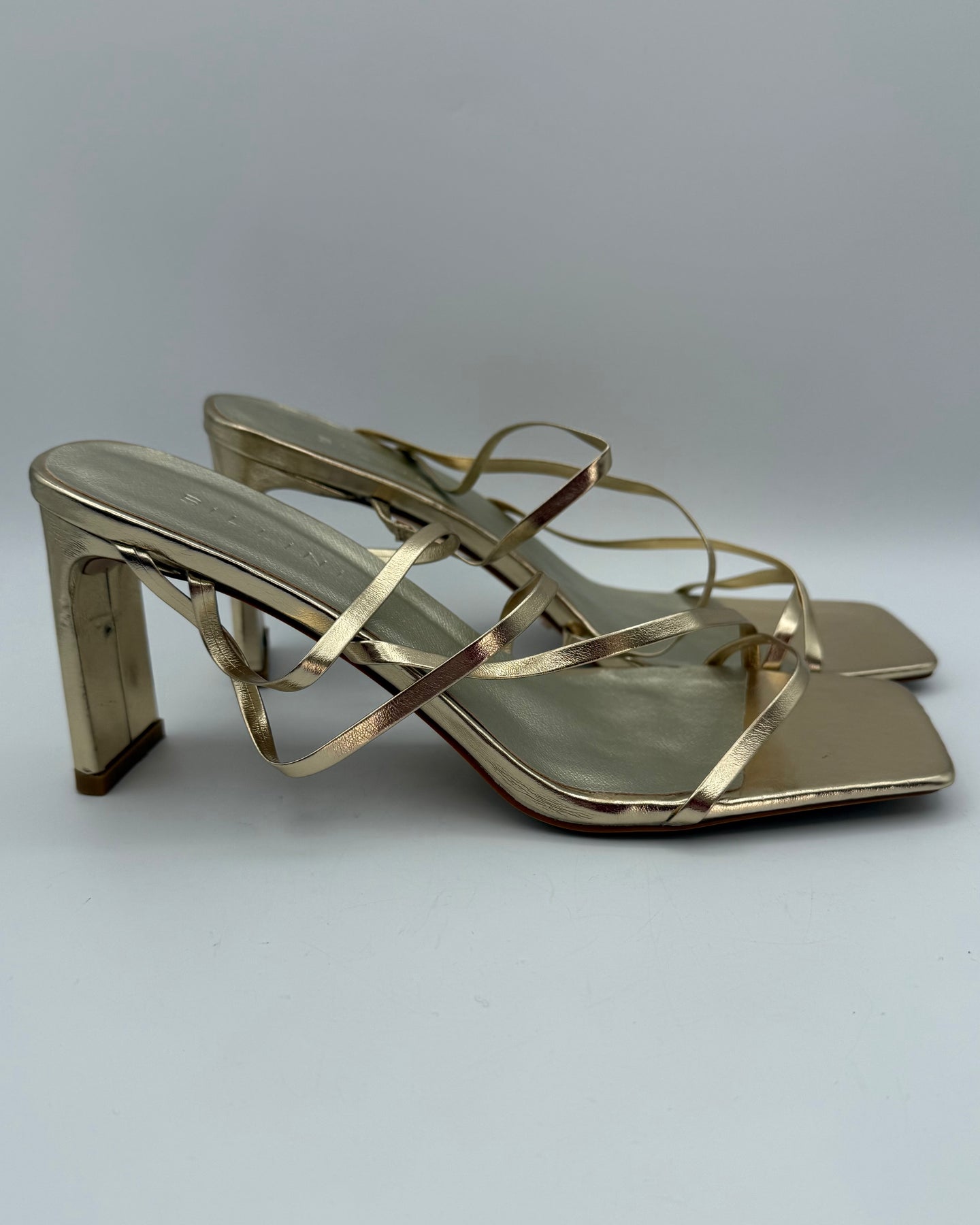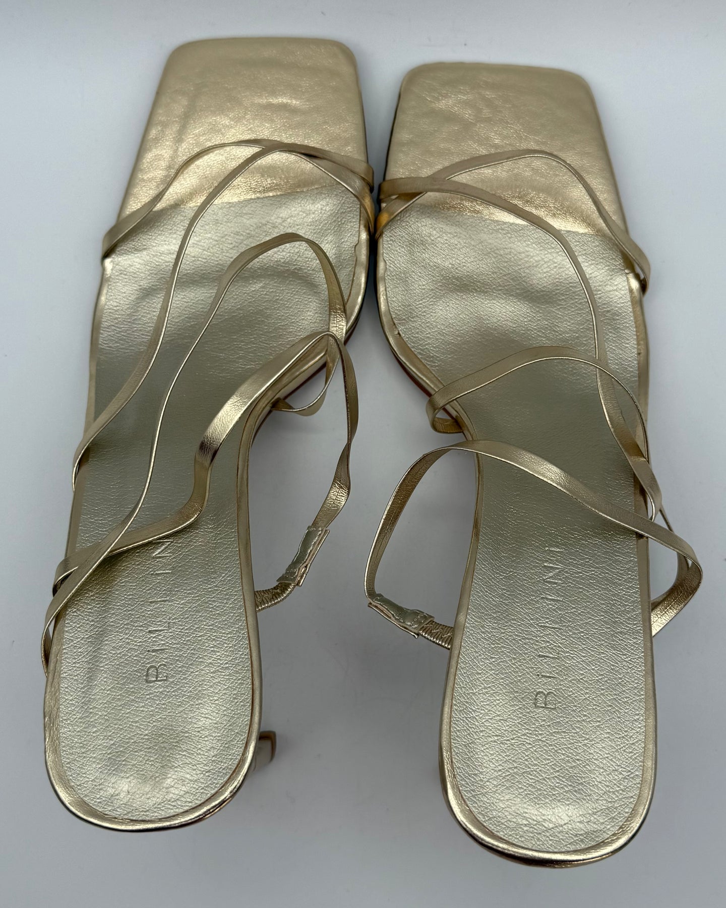 Bellini metallic gold sandal heels with a strappy upper straps, square open toe and thick heel. Please note slight scratches on the shoe but shoe is brand new.