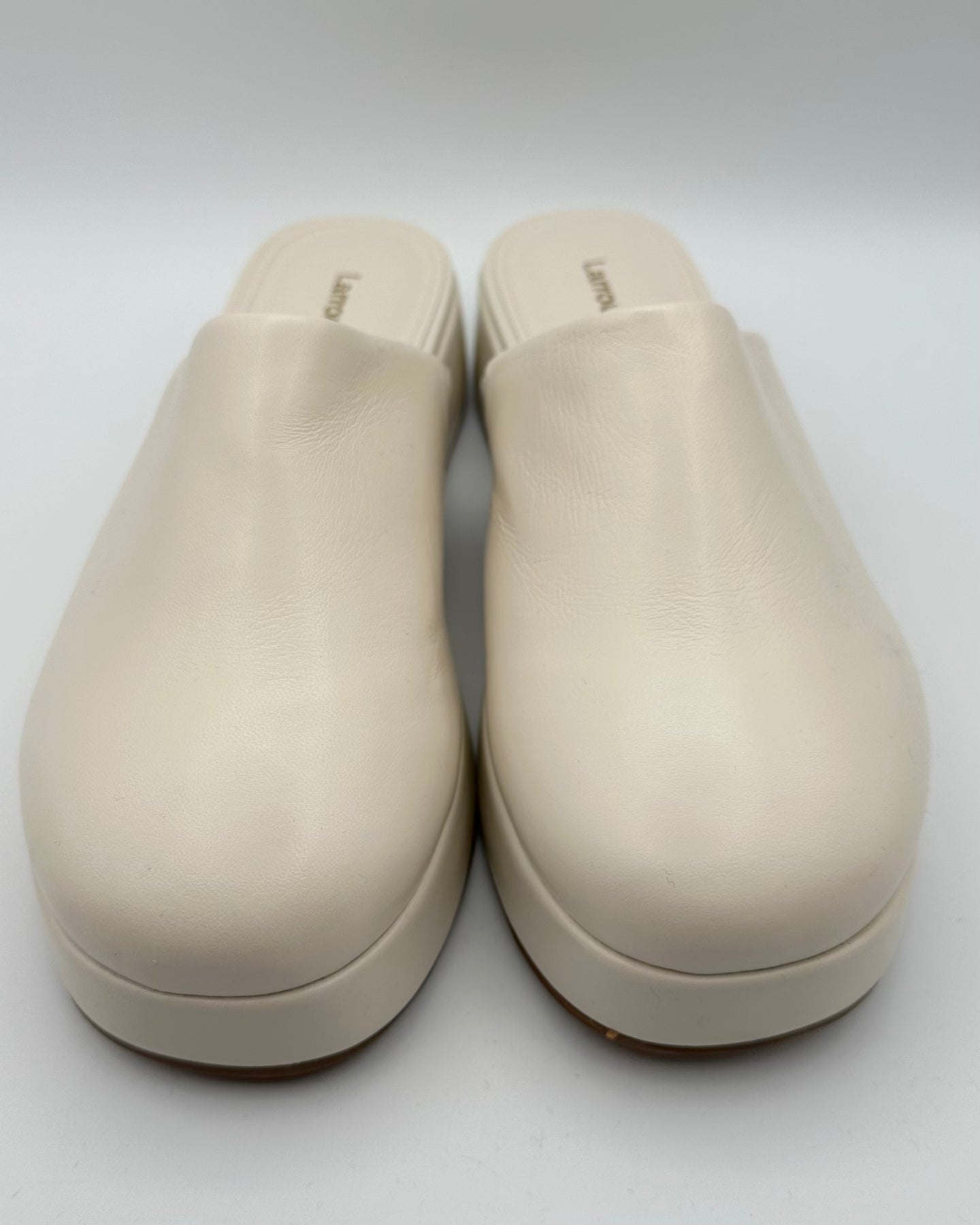 Larroudé ivory patent leather clogs with a closed round toe, slip on style and small heel. Please note slight creasing on leather as shown in pictures but shoe is brand new.