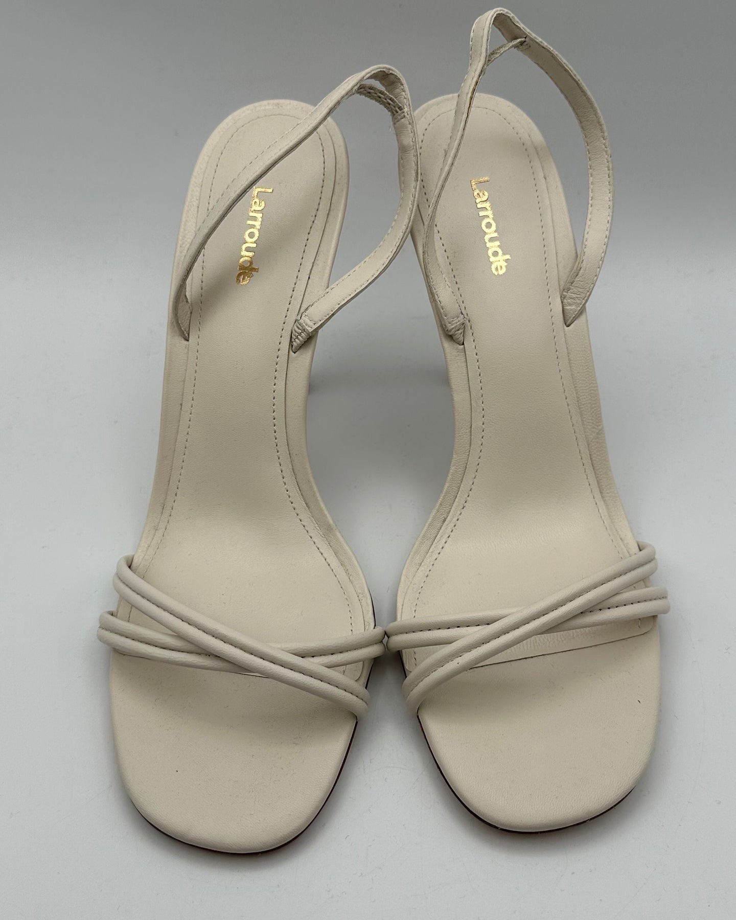 Larroudé ivory leather open toe sandal heels with a thin heel, open round toe and slingback.