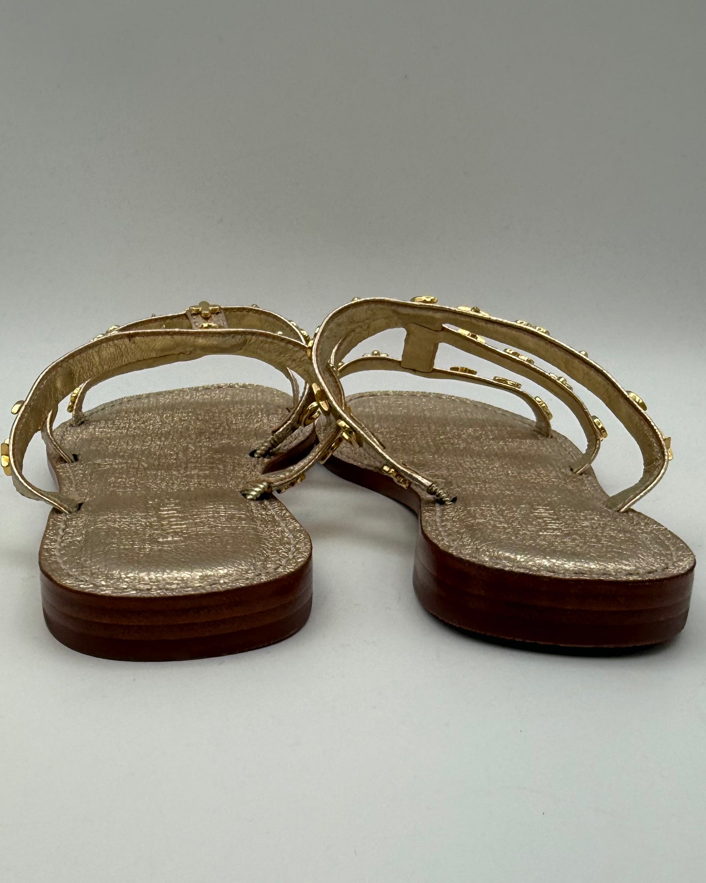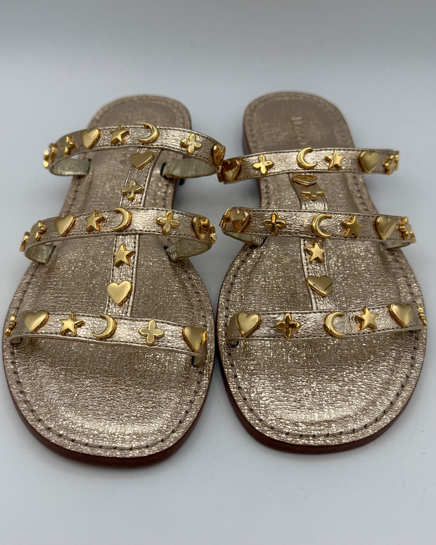 Larroudé crinkled metallic gold leather slip on sandals with an open round toe and moon, star and heart gold decals on straps.