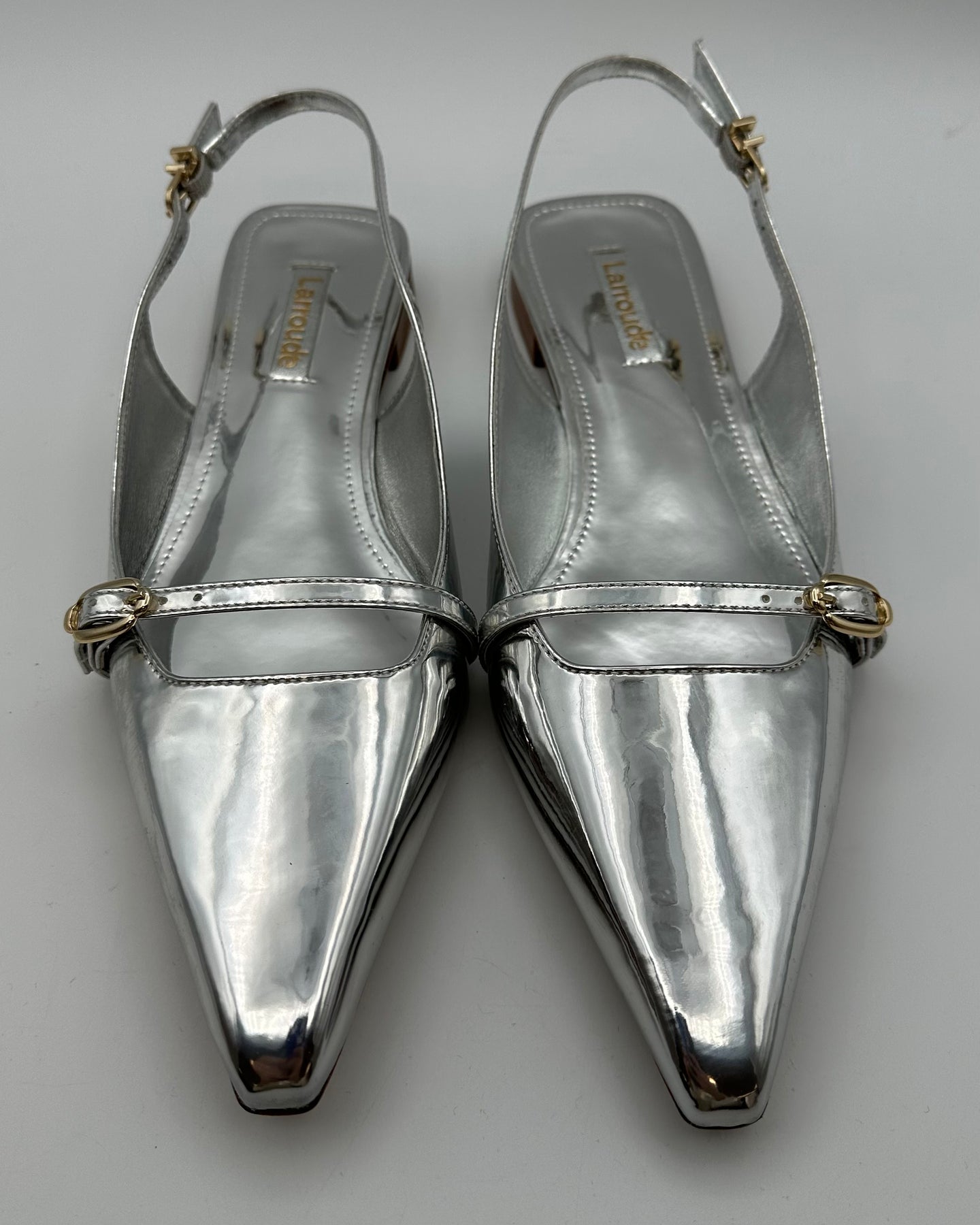 Larroudé silver patent leather ballet flat with a pointed closed toe and adjustable slingback