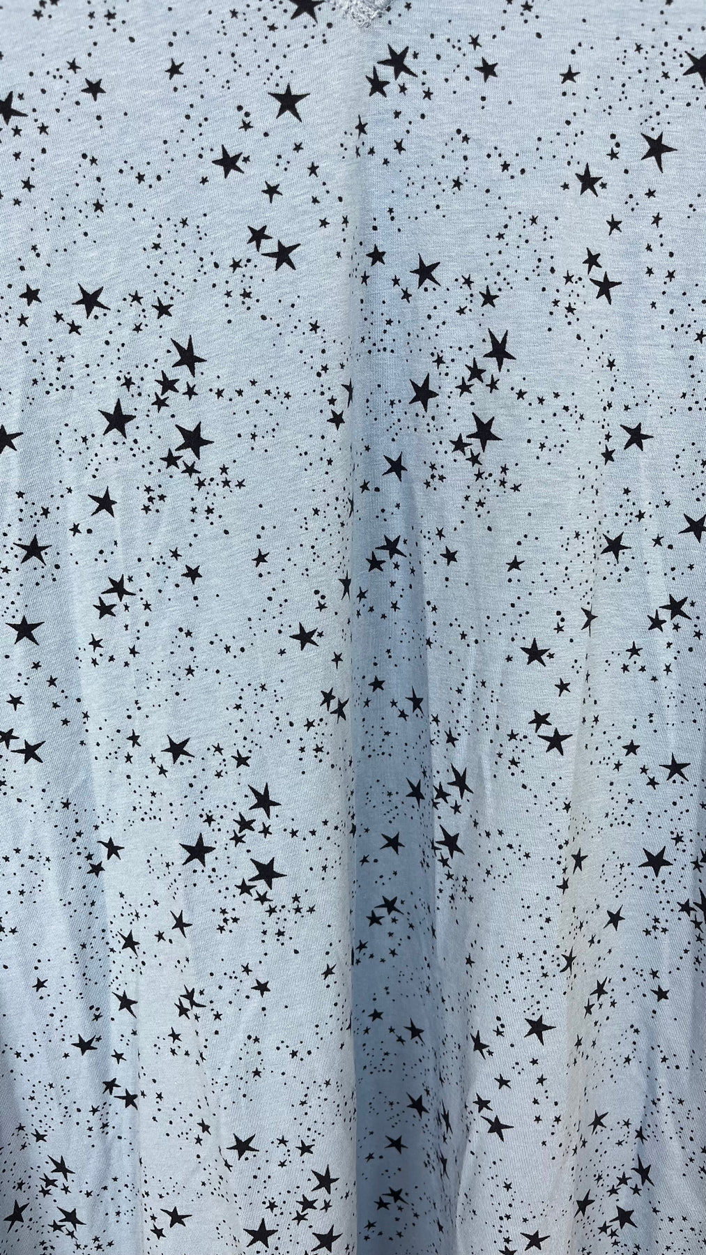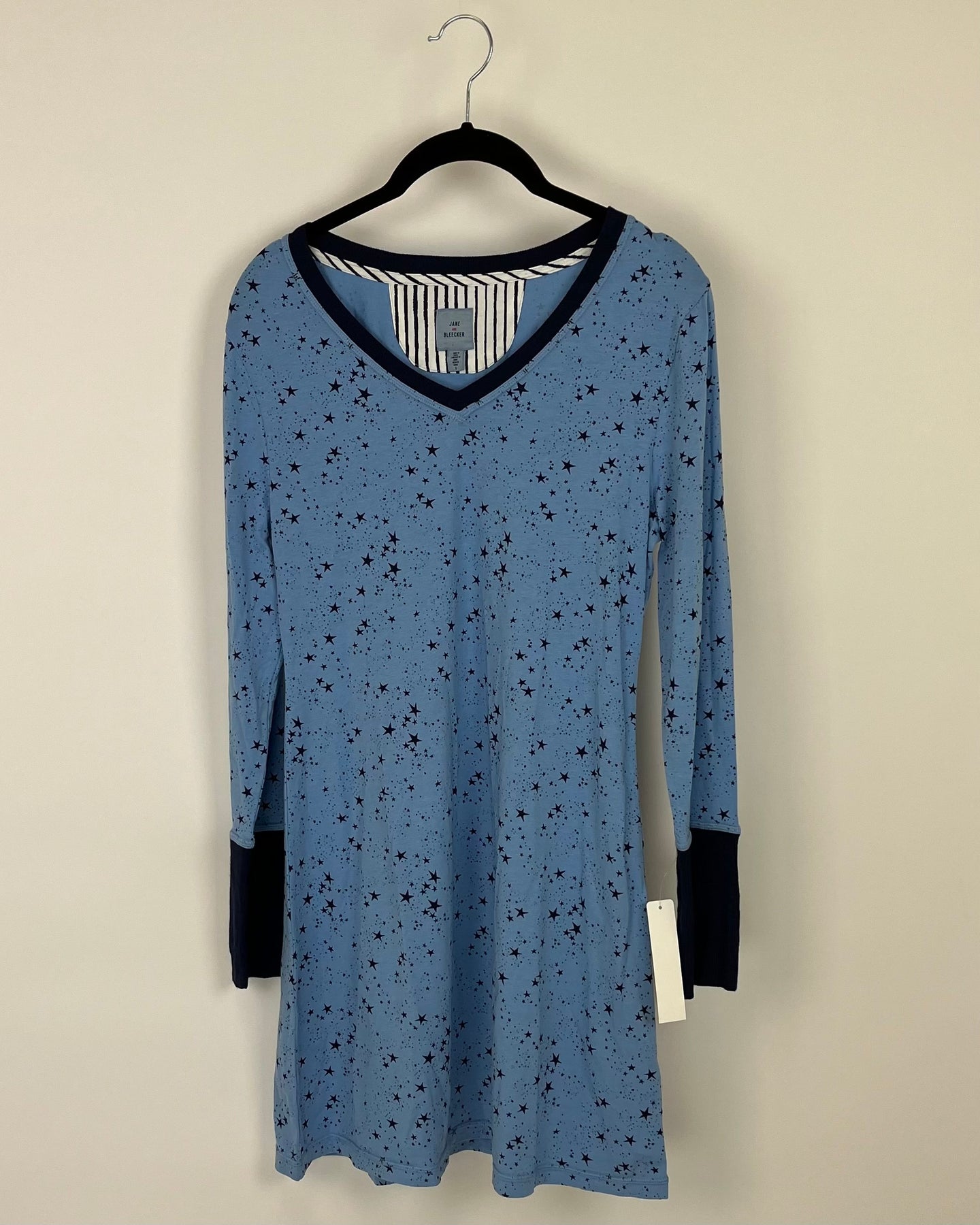 Jane and Bleecker light blue long sleeve lounge dress with navy stars, navy blue v-neck and navy blue lining around the sleeves.