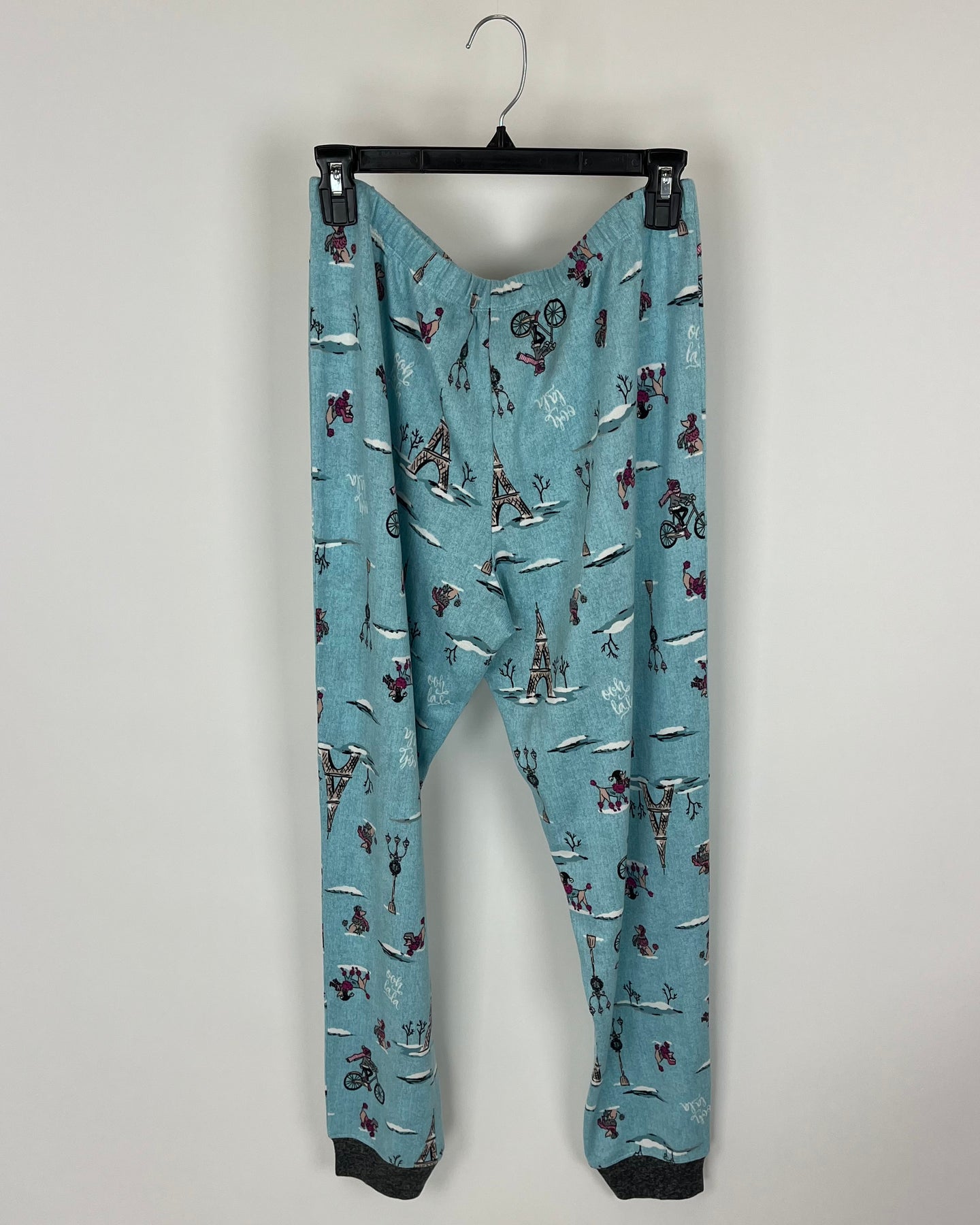 Secret Treasures Sleepwear super soft and stretchy, blue jogger pajama pants with elastic waistband, gray elastic band around the ankle, and a dogs in Paris themed design
