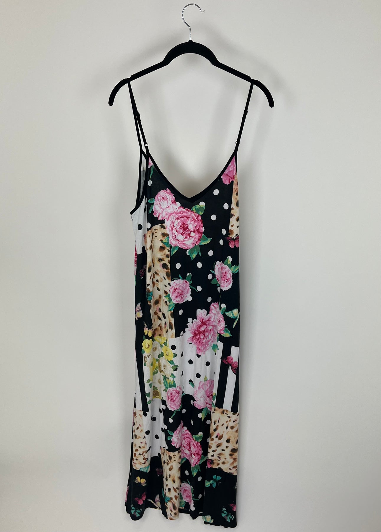 Soft and stretchy, black slip lounge dress with v-neckline, adjustable spaghetti straps, low slits on the side, and a multi-pattern patchwork design with pink peonies, cheetah print, and black and white polka dots and stripes