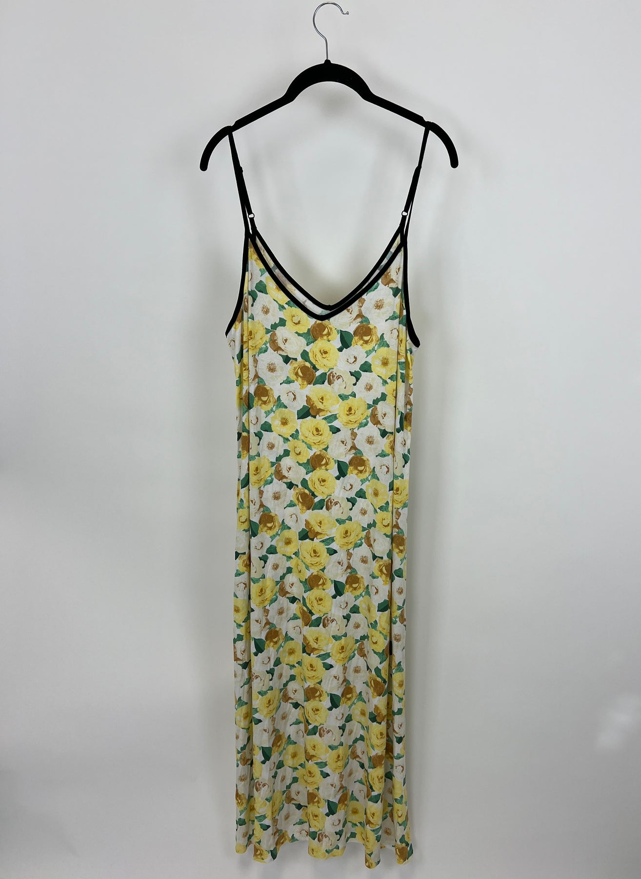 Super soft and stretchy, slip lounge dress with black trimmed v-neckline, adjustable spaghetti strap sleeves, low slits on the side, and a yellow floral design