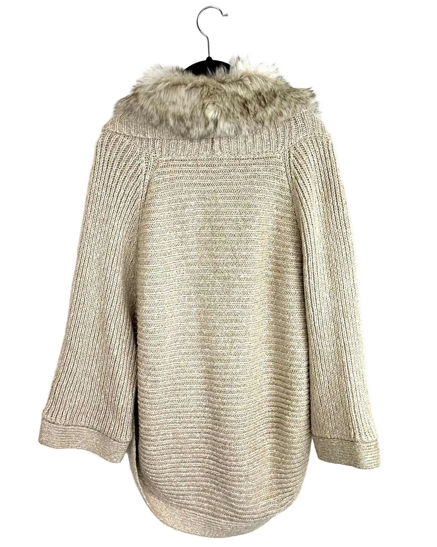 Beige cardigan sweater, soft knit fabric material with ribbed texture detailing, detachable faux fur trim collar with button closure, drop shoulder 3/4 sleeves, with black mini belt and snap button front closure with gold hardware and a rounded longer back hemline