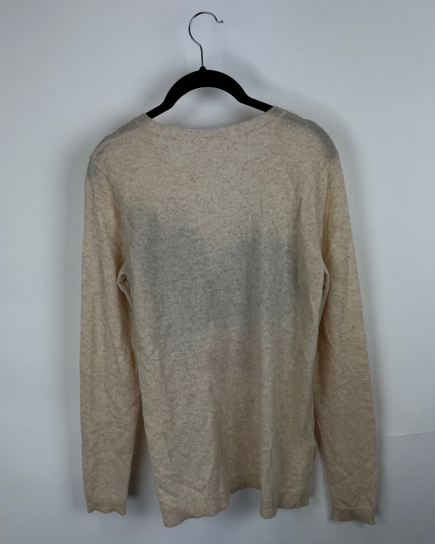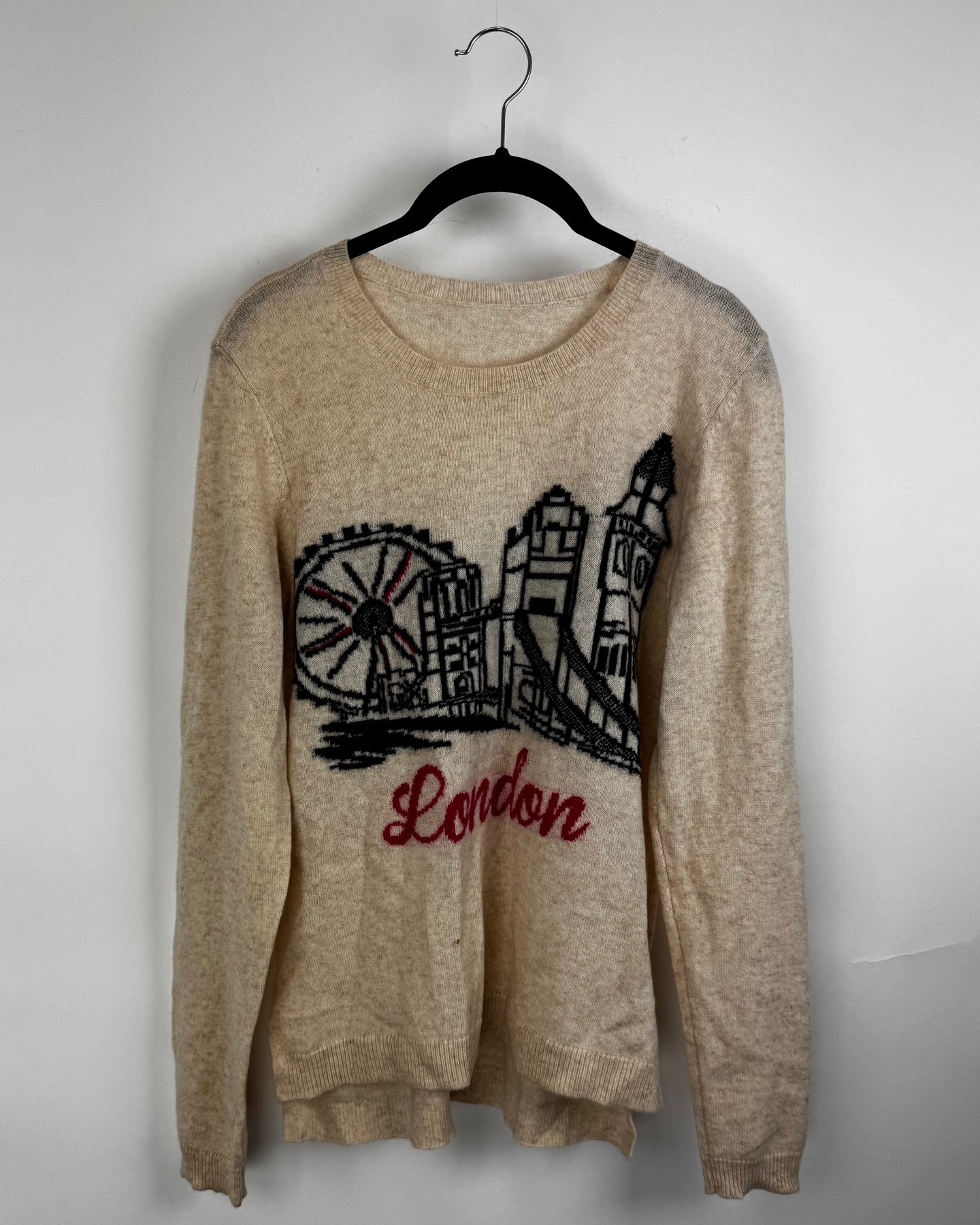 Beige sweater with graphic design of London monuments, "London" written out in pink script, soft, cozy, and round neckline