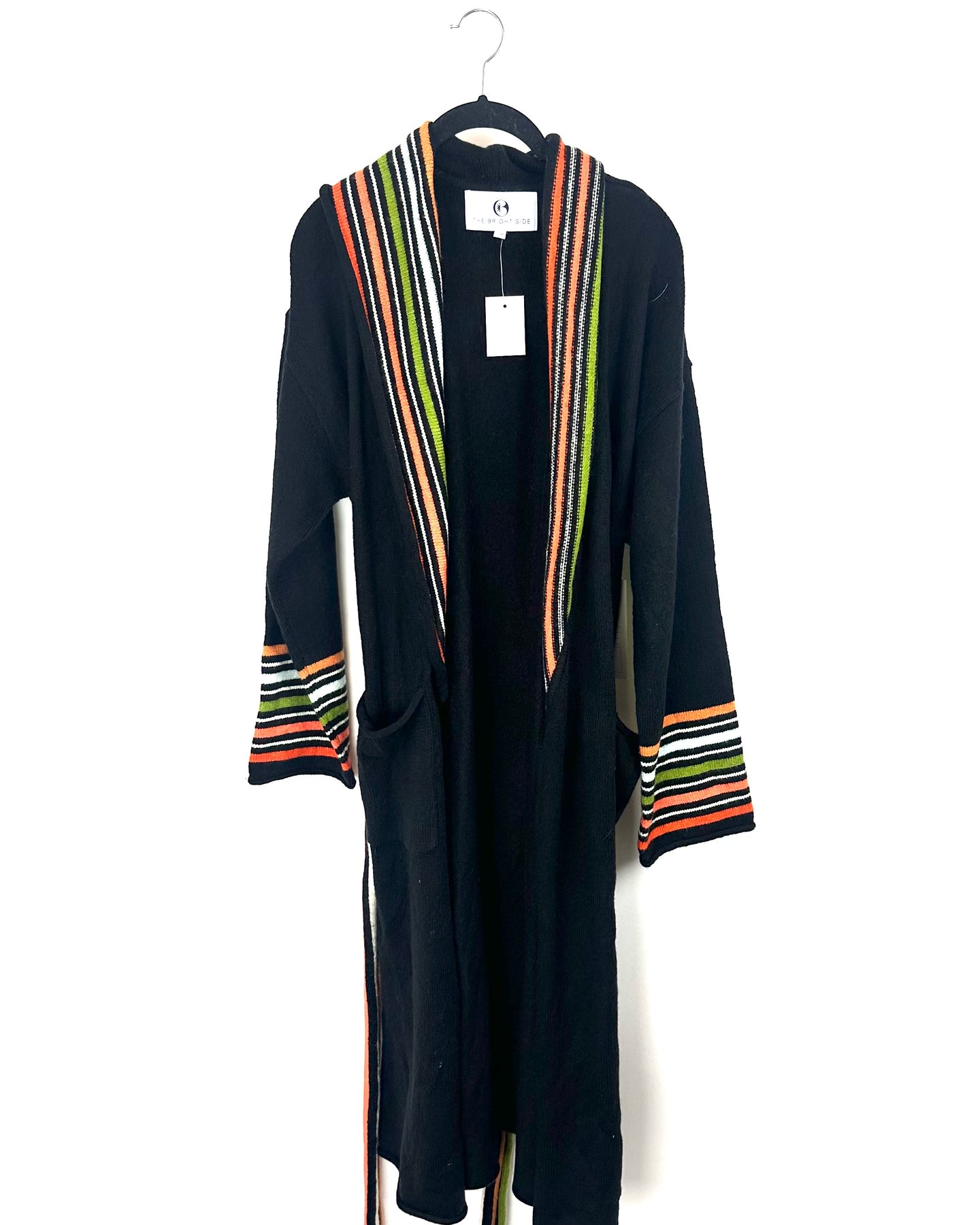Black long open cardigan, with a green, white and orange stripped design on the edges, cuffs and belt, long sleeves two front pockets with a mushroom patch on one pocket, in a soft heavy material