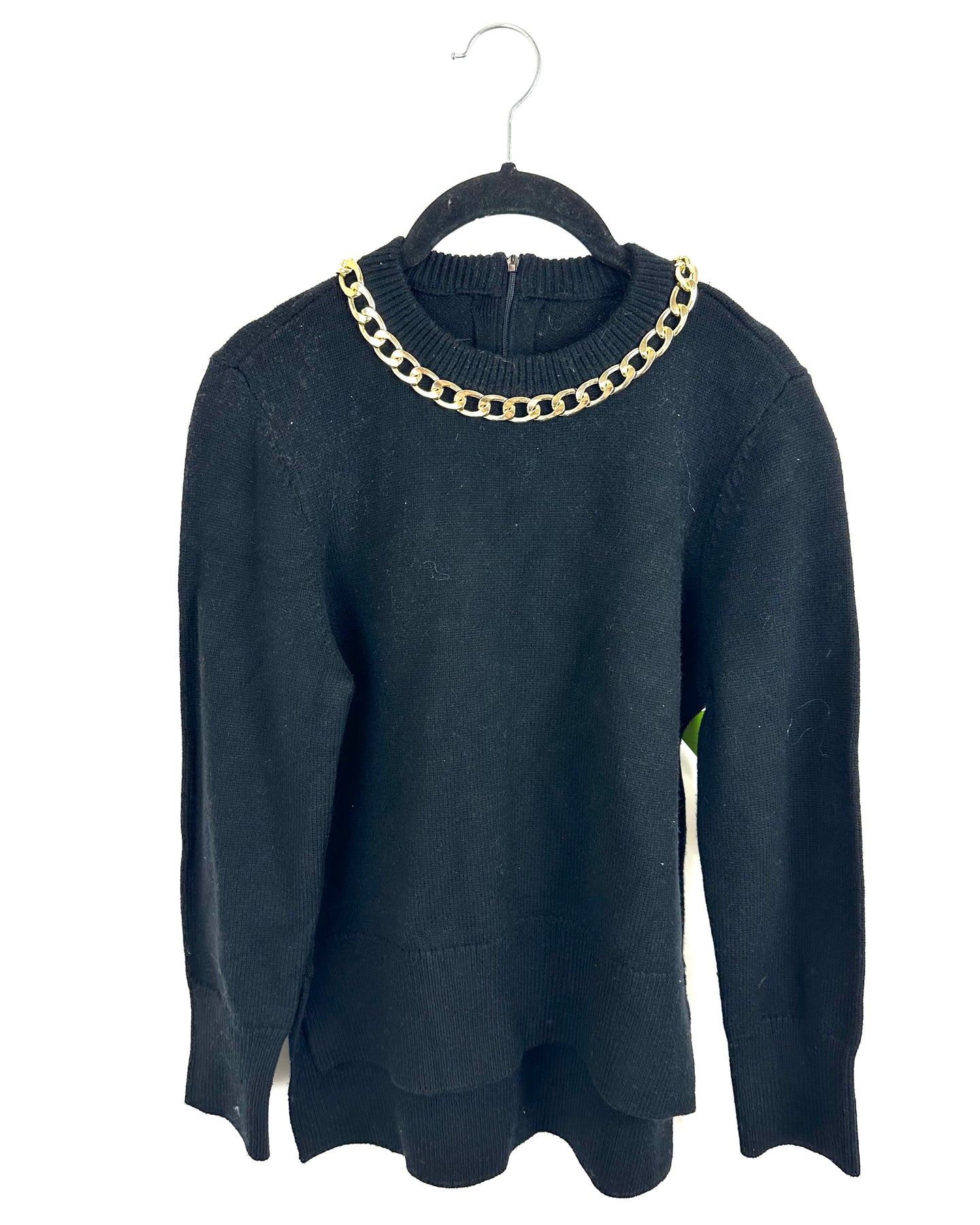 Black soft, cozy, heavy weight sweater with gold chain around neckline, zipper in back, and asymmetrical hem