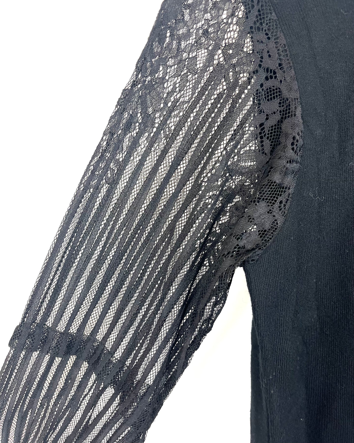 Unknown black turtleneck sweater dress with lace sleeves, additional lace fabric at bottom hem of dress.